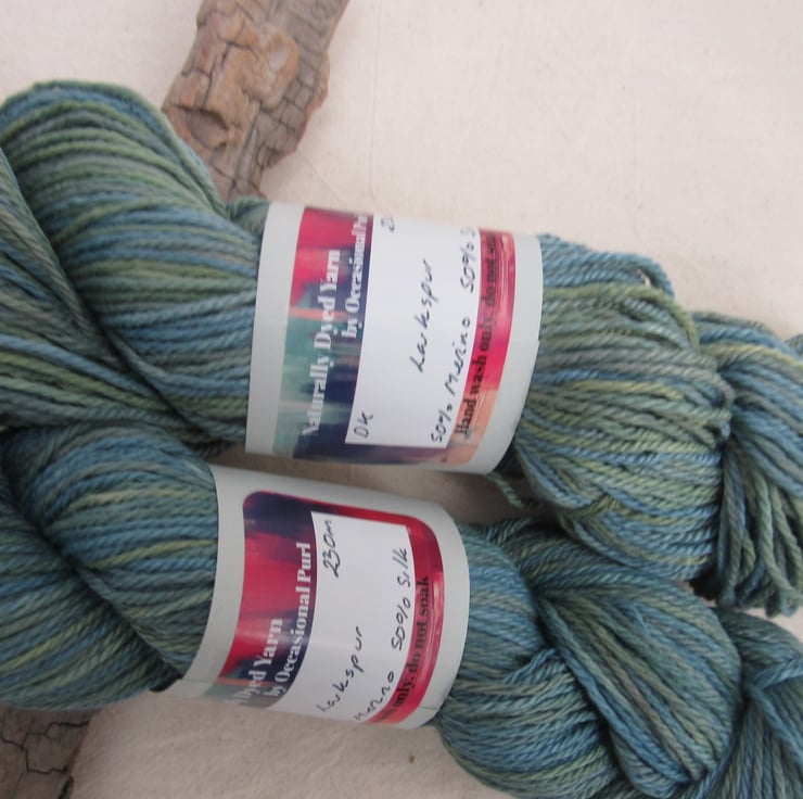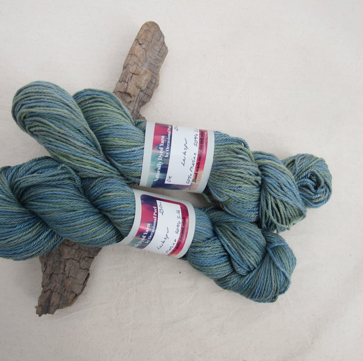 100g soft 50% Merino, 50% silk DK weight yarn dyed with a range of natural plant dyes to give a shaded pattern of varying blues and greens.