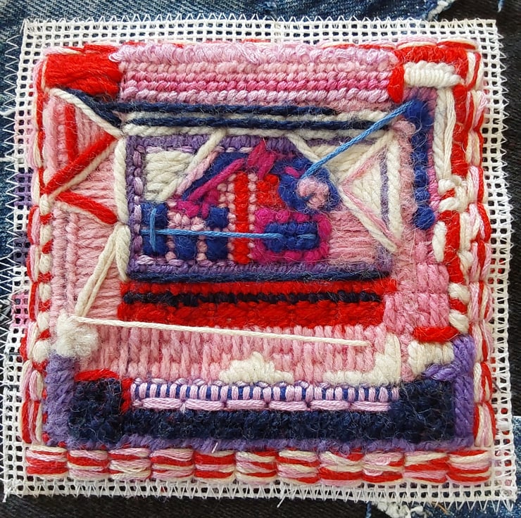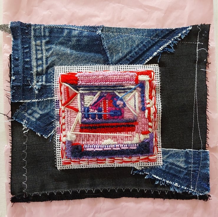 Sewn on aida fabric, most likely canvas; attached to denim remnants.