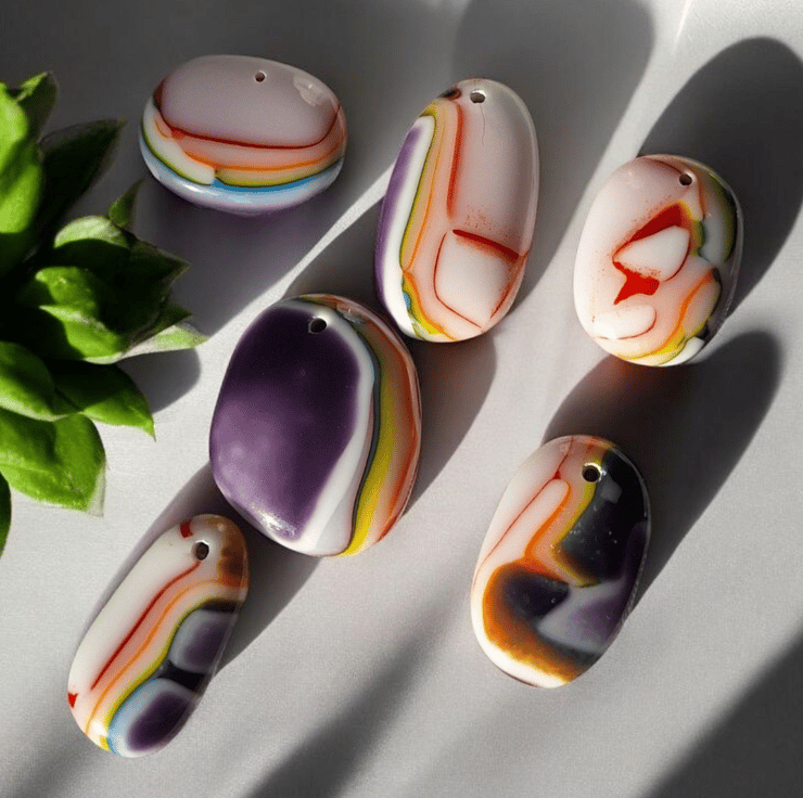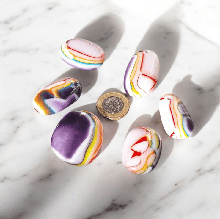 Add a splash of artisan colour to your craft stash with this bulk set of handmade fused glass cabochons created in my home studio in Blackpool. I begin each batch by making a blank of layered Bullseye glass and firing it in the kiln for almost 24 hours. Once cooled, the glass is cut into pieces, thoroughly cleaned, then fired again to smooth the edges and give a glossy finish.