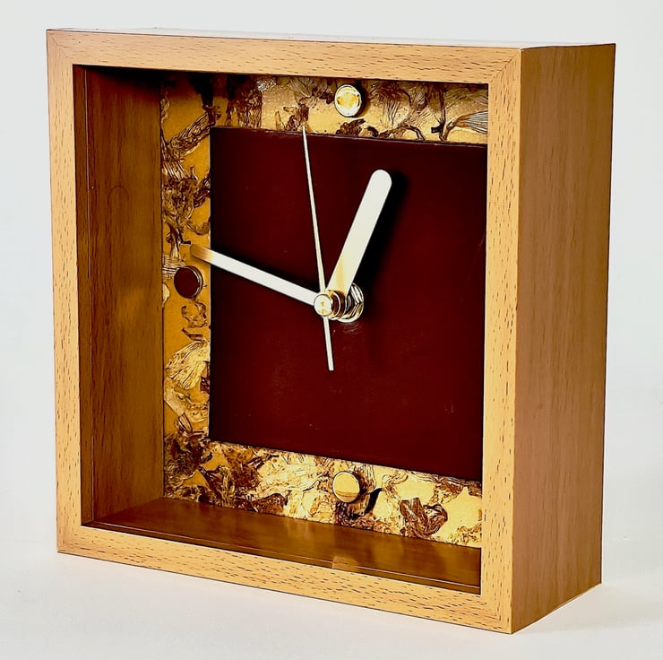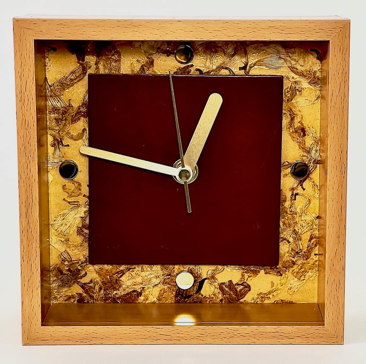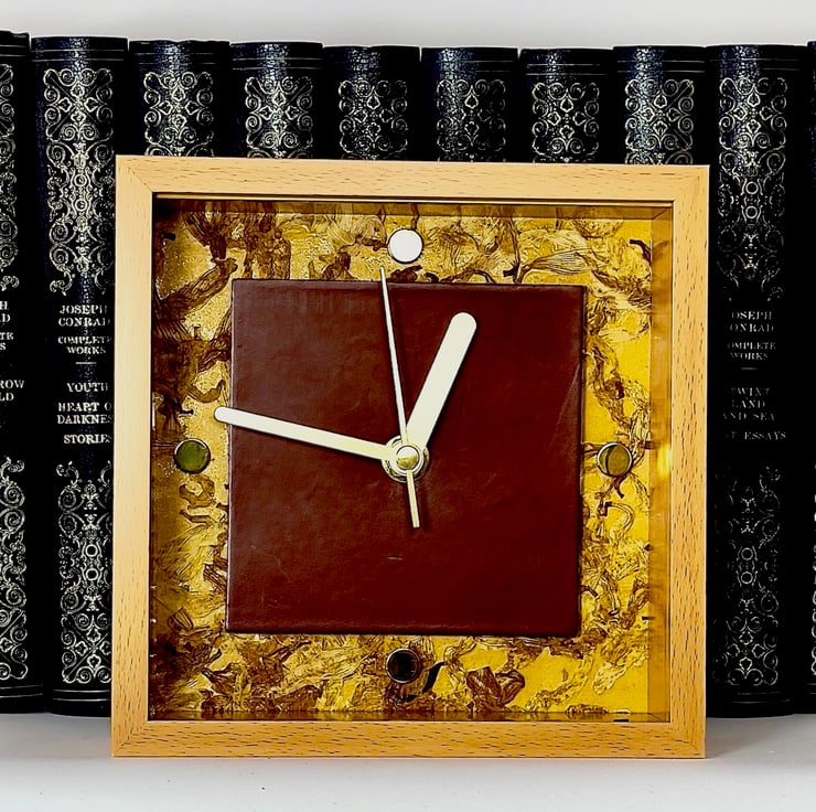 A unique, one off, hand made table or shelf clock made by me in my London studio, inspired by a buffed leather sample, (normally utilised as a prestige floor covering) 'clock face' panel, mounted on a beautiful hand blocked compressed plant petal wall covering background, fitted with a silent quartz mechanism (battery included), with satin brass hands & polished brass 1/4hr buttons, all set in an oak effect frame. Dimensions: 165mm/8.5"w.x 165mm/8.5"h.x 6mm/2.5"d.