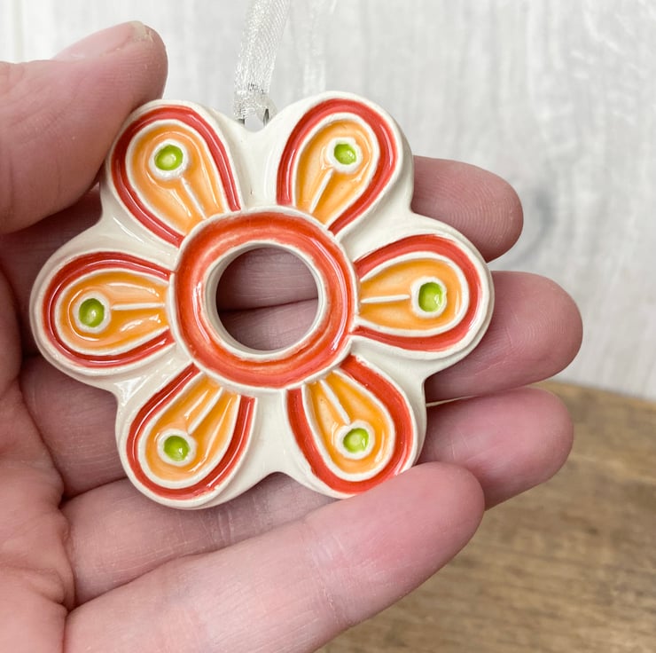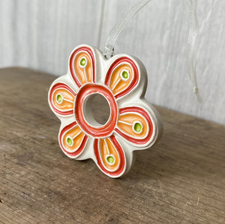 This unusual flower decoration is made from white earthenware clay. It has been fired twice, once to the bisque stage and then a second firing for the glossy glaze. It measures 6 centimetres wide x 5cm height x 0.5cm thick and hangs from a cream organza ribbon.