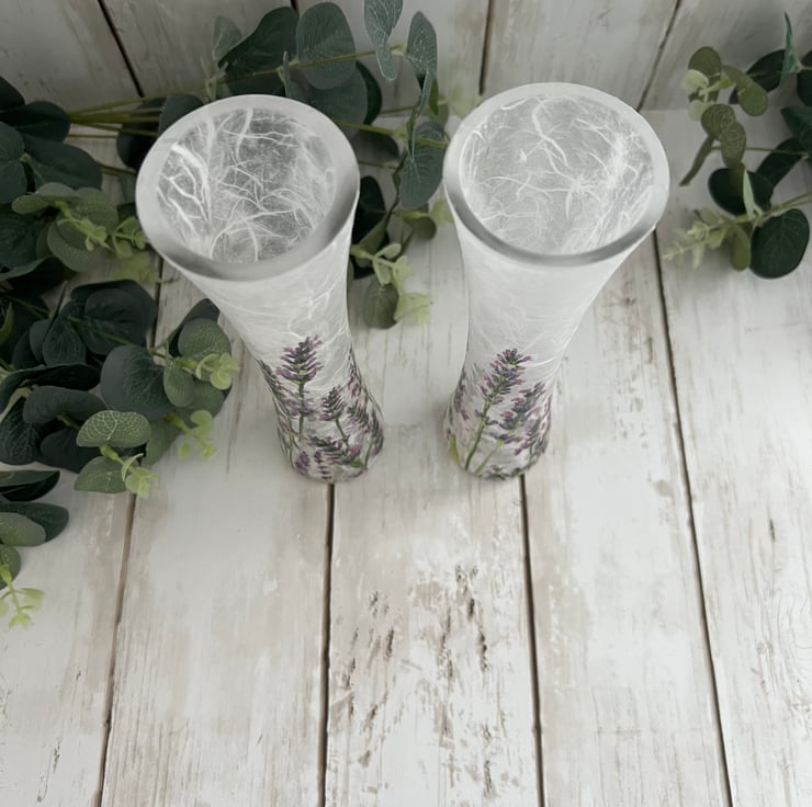 The vase has been decorated using a textured technique in white and then decoupaged with a pretty lavender design. Several coats of heat and water resistant varnish has been applied for protection.