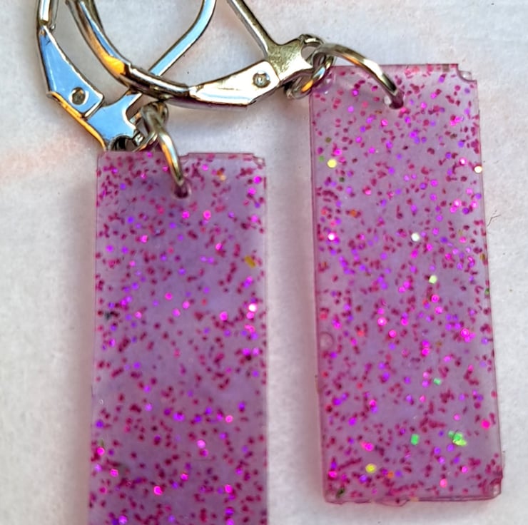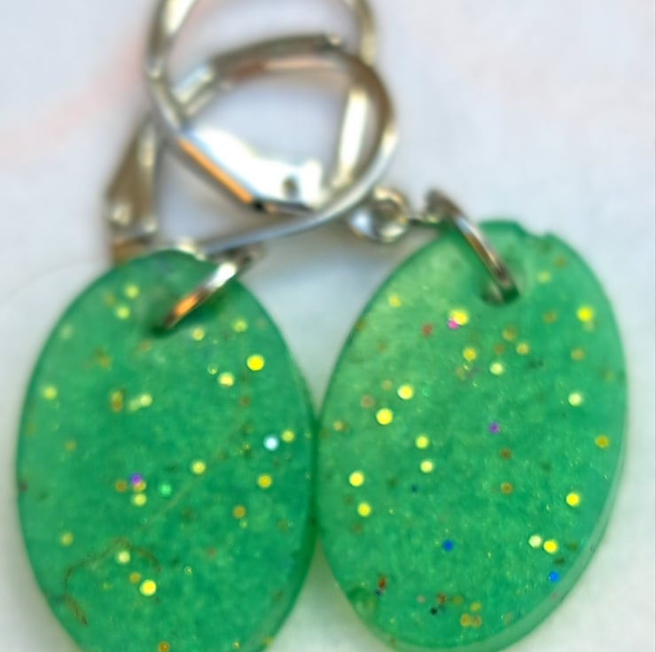 A selection of resin earrings, made from putting resin in a mould and colour and decorations added.
