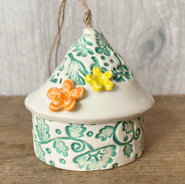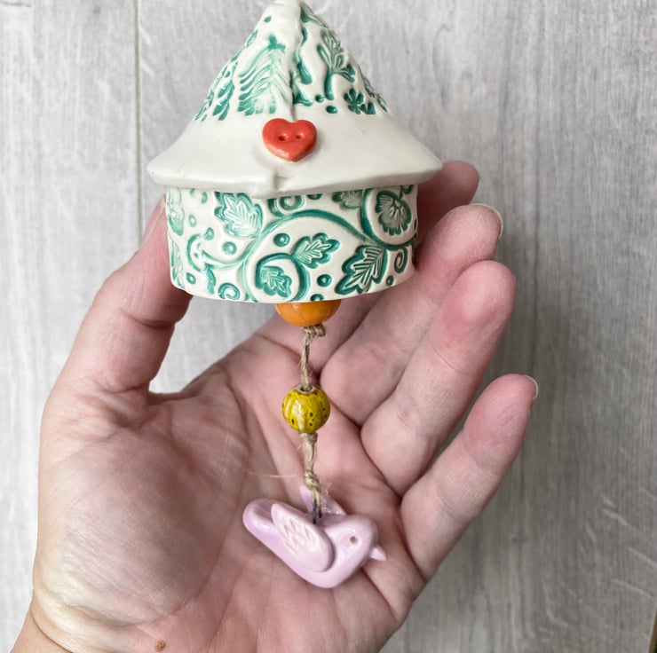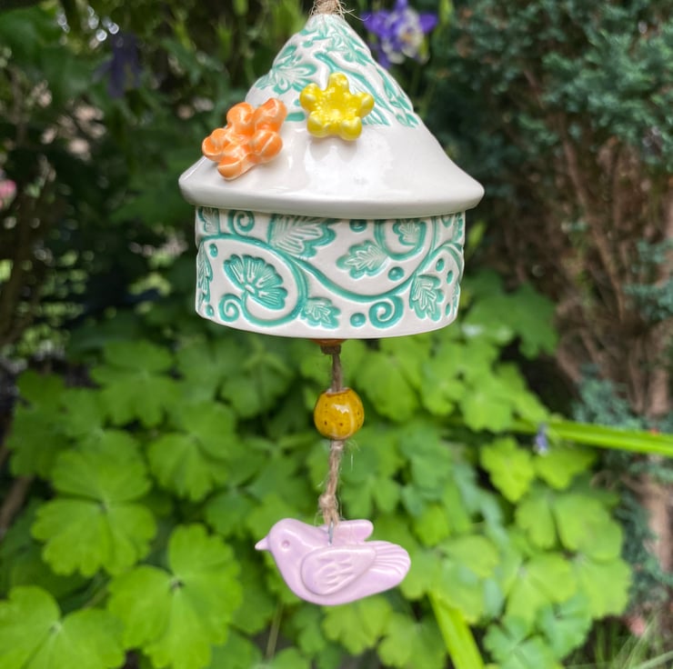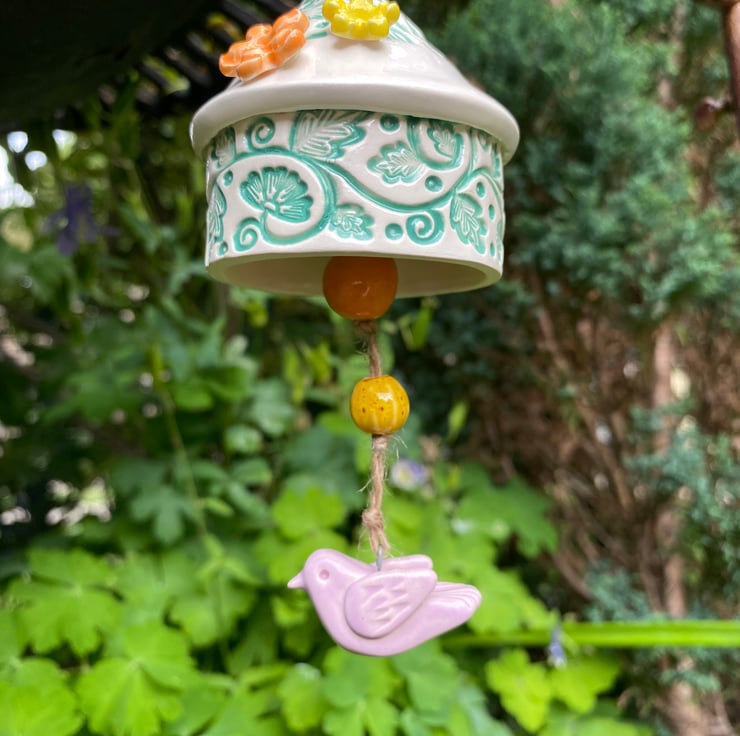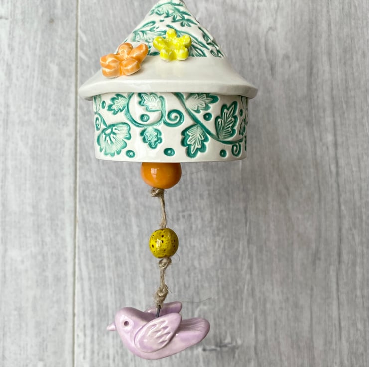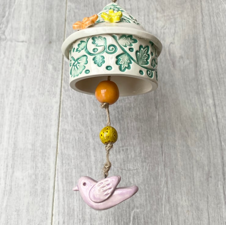 This Bell has been made from white earthenware clay and decorated with a fun, floral design. Inside the bell hangs one clapper bead, a decorative bead and a little bird!