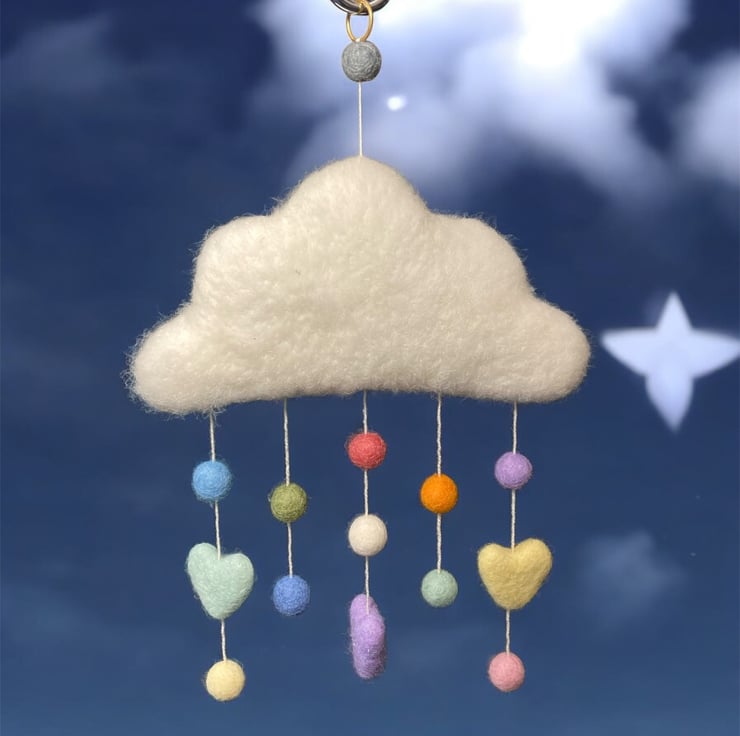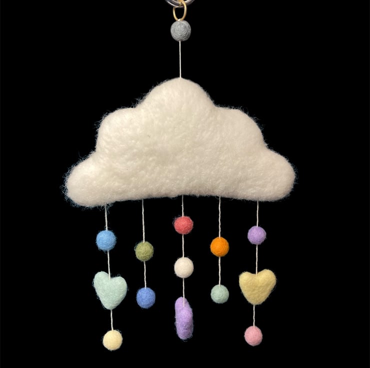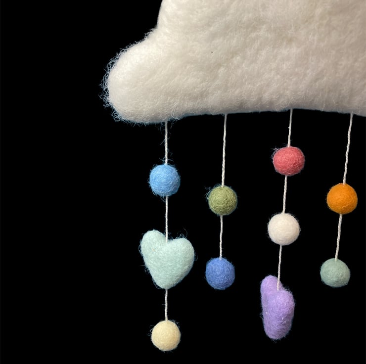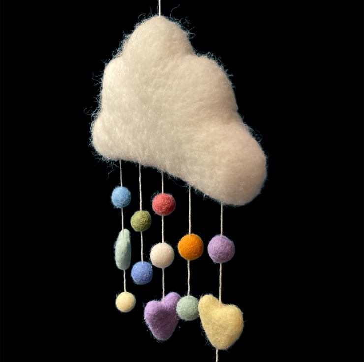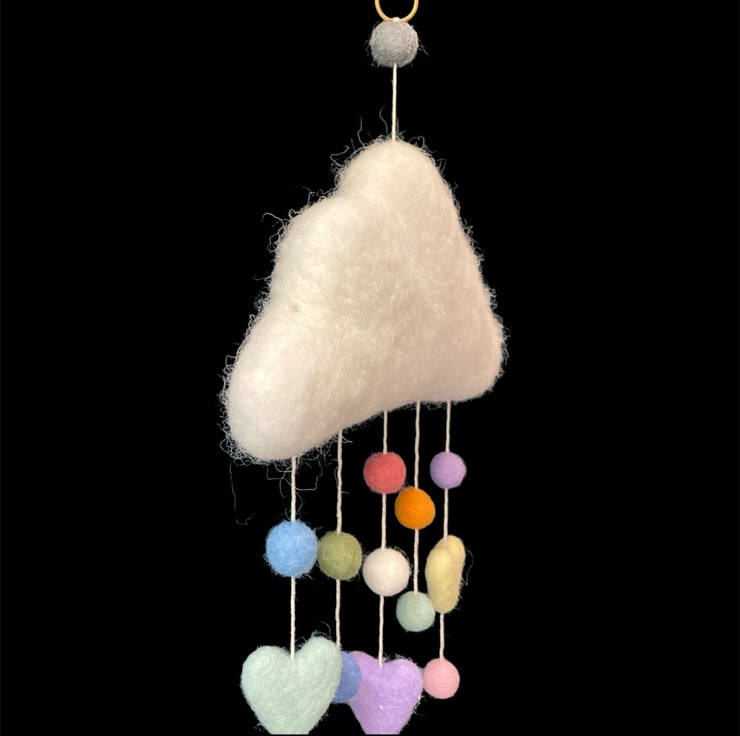A large fluffy white felt cloud with pastel coloured felt balls and hearts hanging below which would make a lovely nursery decoration or could be hung in any room in the house. The felt cloud is lightly padded to create a three dimensional shape, approximately 3cm thick. Multicoloured felt balls and three felt hearts in pastel shades have been strung on cotton thread and are suspended below the cloud. At the top a small brass ring has been added to facilitate hanging. The decoration can be hung on the wall or suspended as a mobile to spin in the breeze. A perfect gift for a new baby or baby shower.