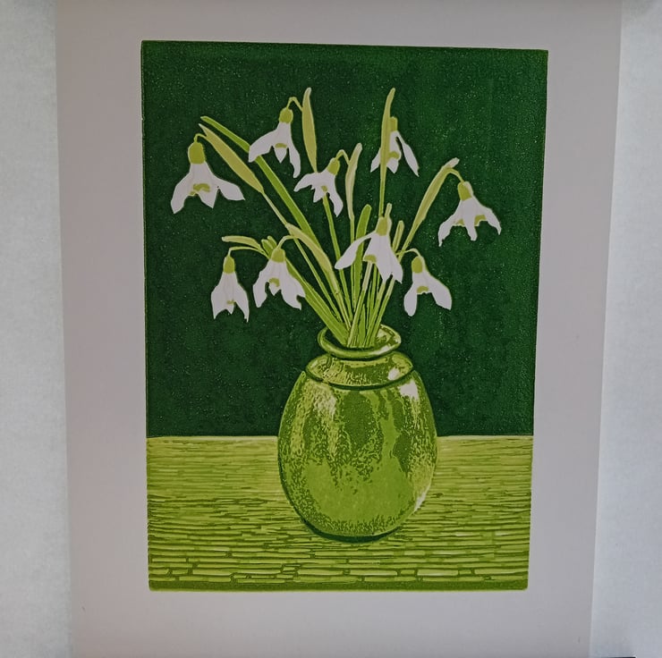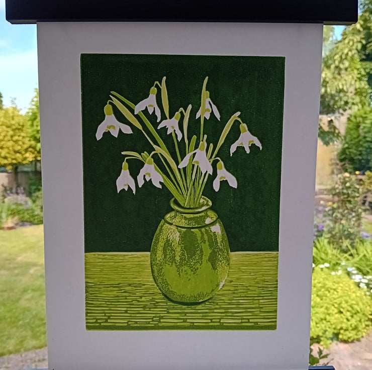 An original reduction lino print from my limited edition 'February Joy' snowdrop print.. This is an AP (Artist Proof) it is not part of the limited edition of just 11 prints which all have a dark green background. This one has a blue-green background, and is the only one, as I decided on the green for the edition.