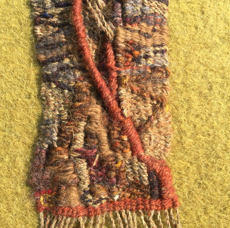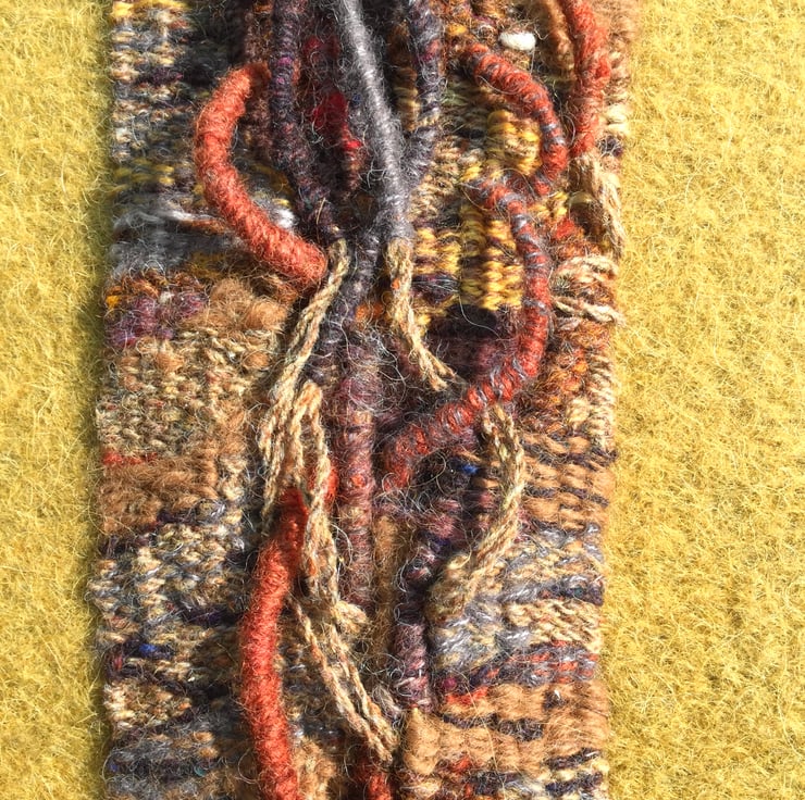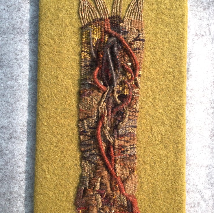 Arboreal 3 is a one of a kind, mounted tapestry weaving which has been handwoven with various wools, including some of my hand spun and hand dyed wool. It is woven in various shades of brown, ochre , grey, and red on a brown wool warp. I have used eccentric weave and random weave techniques to create texture and pattern and I have added extra warps or supplemental warps, and woven them or wrapped them to create more 3 dimensional elements which I have woven in and out of the body of the weaving. It is stitched onto a piece of felt covered mdf which measures 22 x 41 x 2cm and hangs from d rings with picture twine.