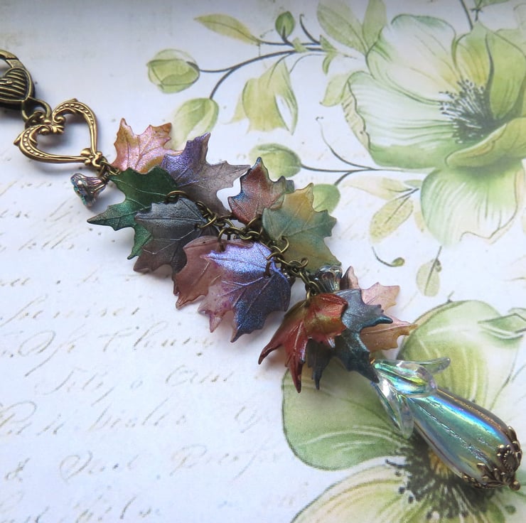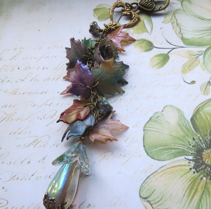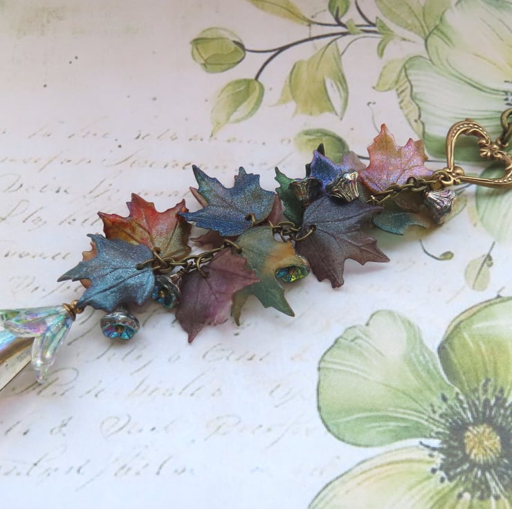Featuring cascading hand painted maple leaves, little iridescent Czech glass flowers and ending in a lovely iridescent Czech Glass teardrop bead adorned with a hand painted bead cap.