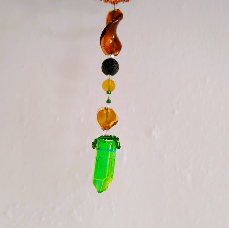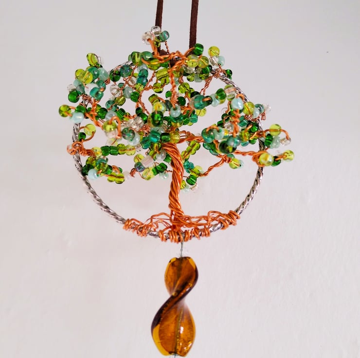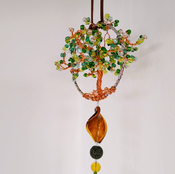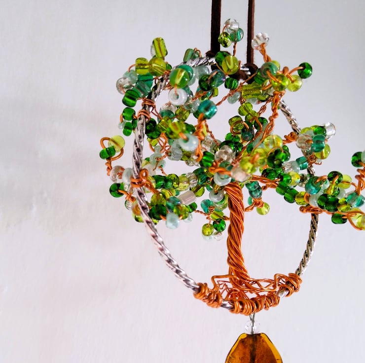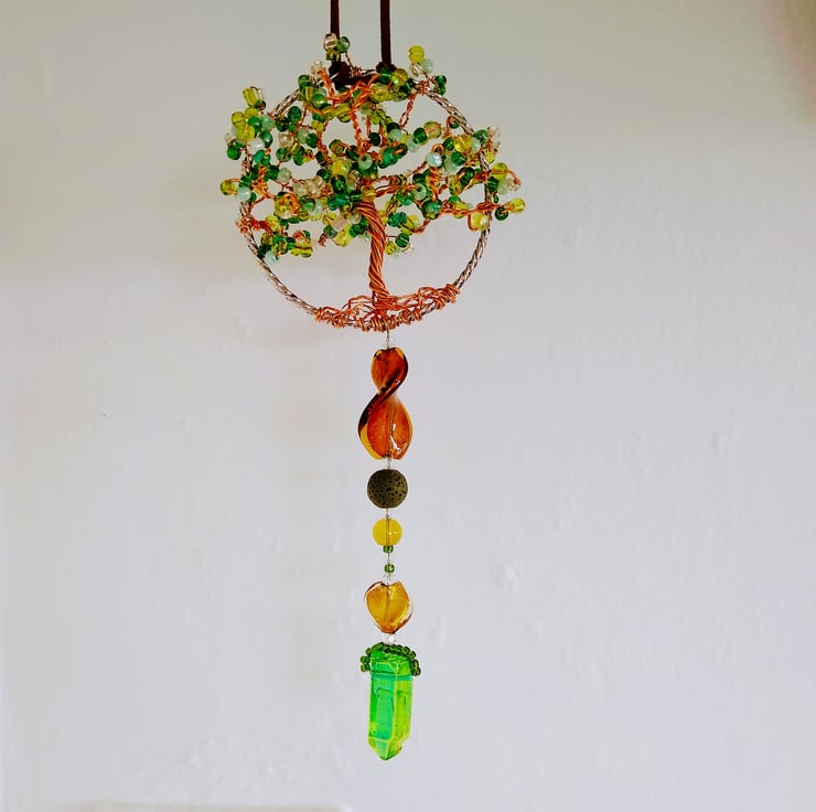 The light will glisten through this organic shaped, 3d copper hand formed wirework tree suncatcher. With its shades of vibrant green glass seed bead style leaves and citrus dark lime Quartz gemstone point pendant. The large twisted glass beads hung below the tree add to the movement effect of the quartz pendulum. Easily hung from a ceiling or window hook (not supplied) by tying it on with the faux suede cord, allowing the suncatcher to move gentle with a passing breeze.