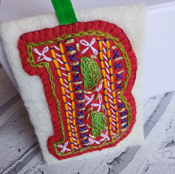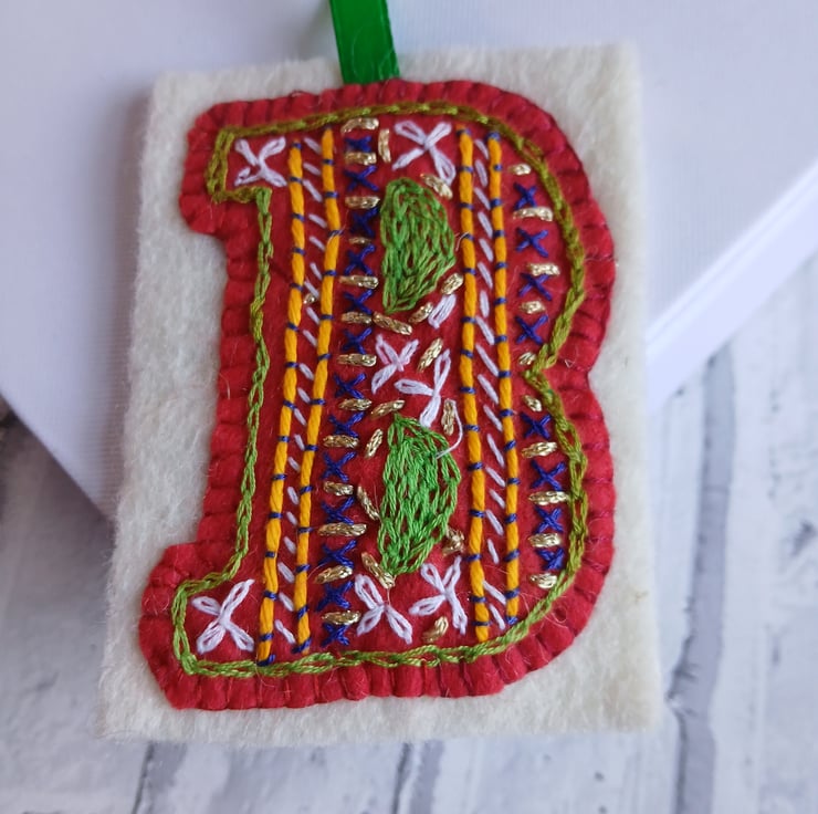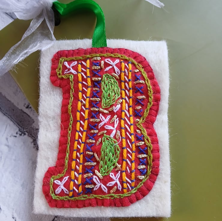 Beautiful hand embroidered letter 'B' on felt. Measures approx 3x4 inches.