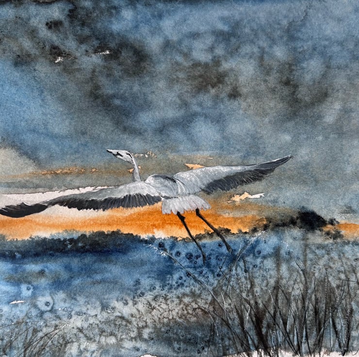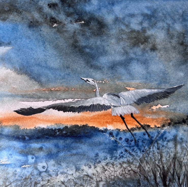 The Heron is leaving the marshland as he looks for safety in this A4 original watercolour painting. The painting will be sold in a presentation mount. Perfect for gifting and framing