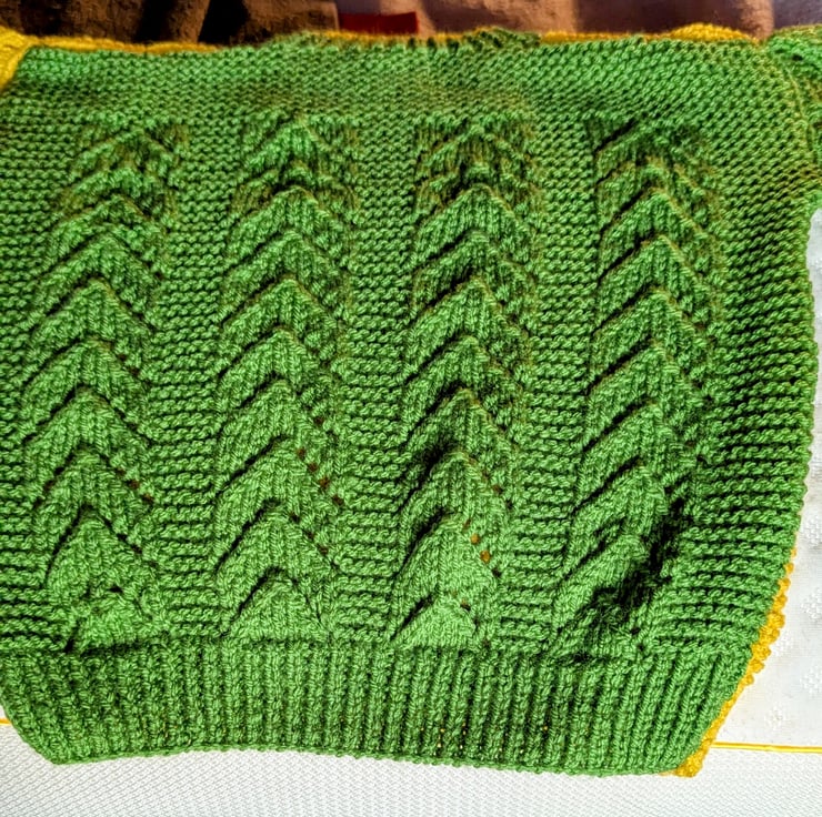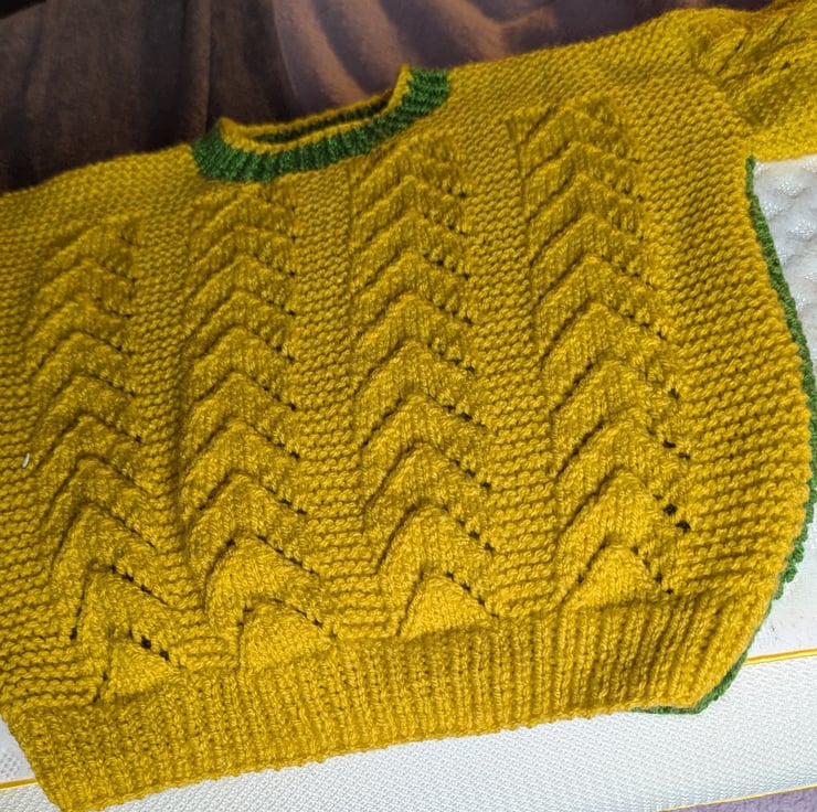 Jumper knitted in a fetching feather pattern, front, back and sleeves. Colours are Ochre and Forest green, alternated front, back and sleeves. Suitable for outings and playtime in the park. Round neck in rib using both colours to top off the jumper nicely.
