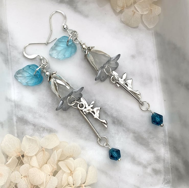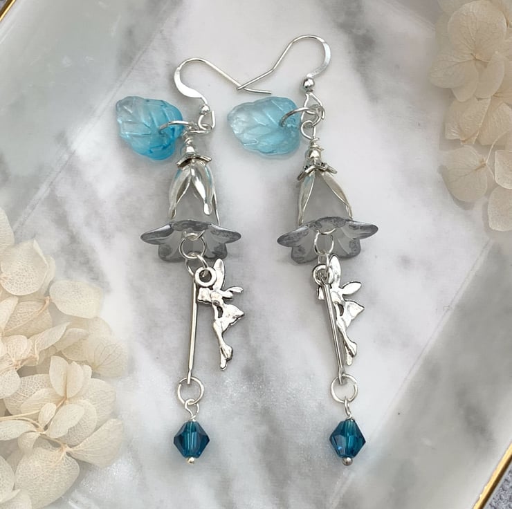 These charming earrings are made in a pretty Cottage-core style with hand-painted white lucite flower beads which have tiny silver fairy charms and blue glass drop beads that hang from the earrings. The earrings are topped with silver petal bead caps plus small blue glass leaf charms. The earrings are finished with silver-plated ear hooks and they are 7.5cm in total length.