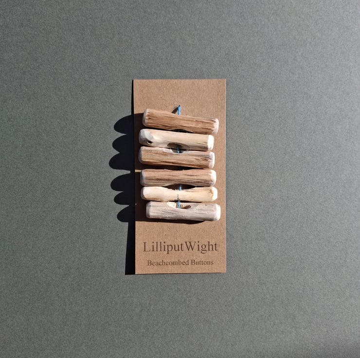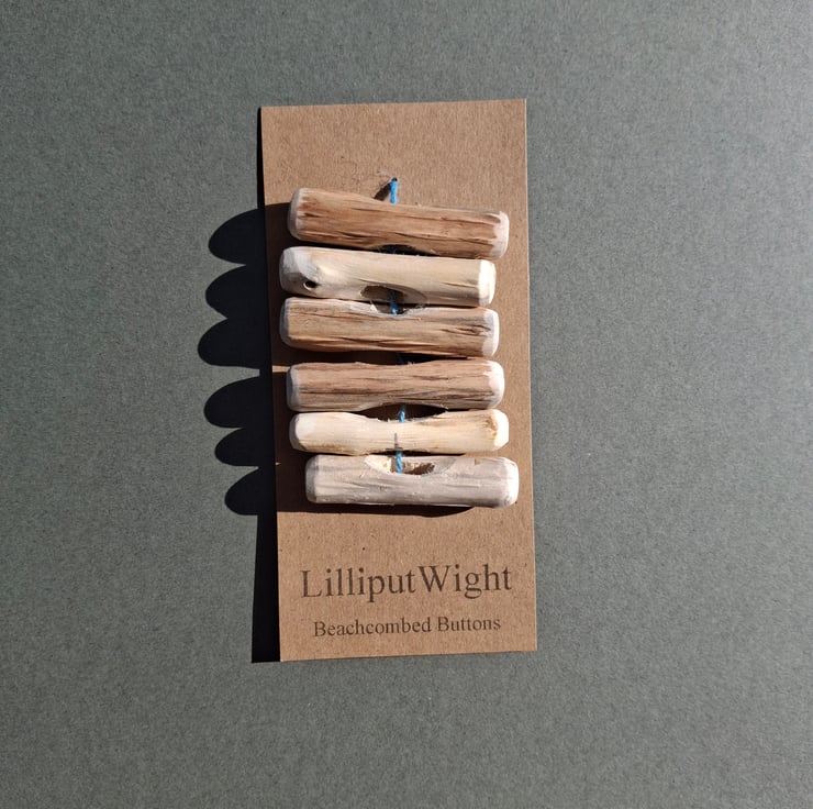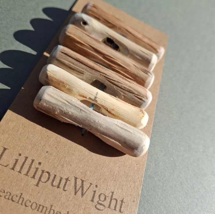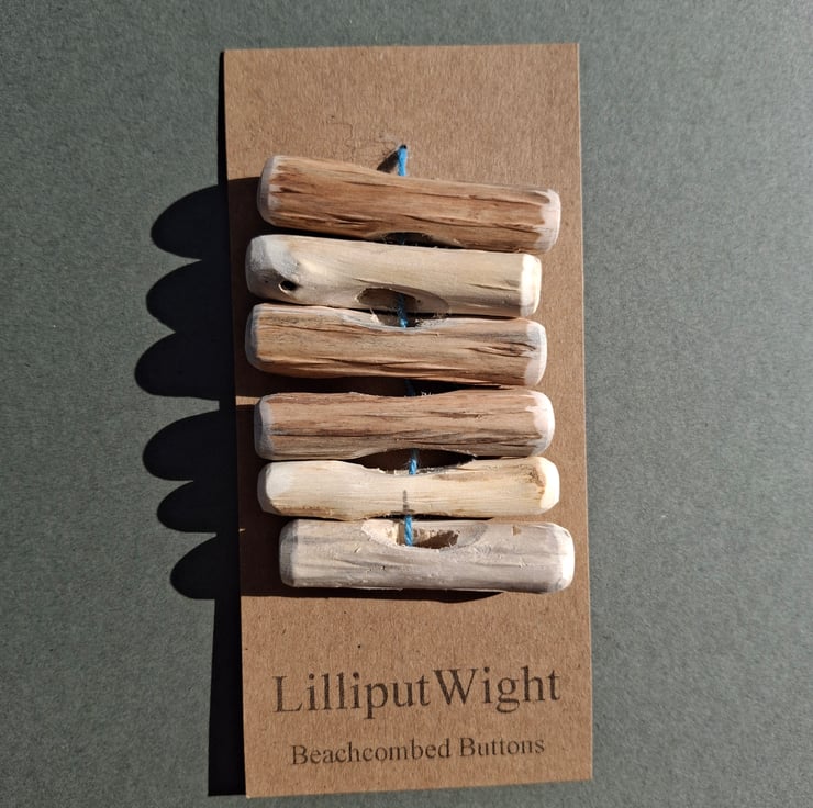 These buttons have been handmade by me in my dad's shed. The driftwood has been collected during walks on the beach before being washed and dried and making the short trip to the shed.