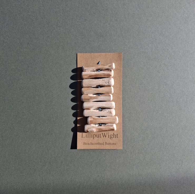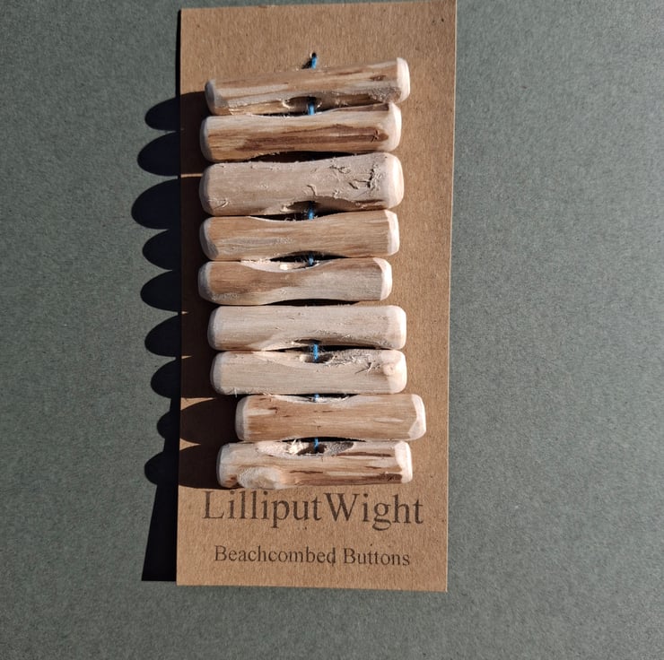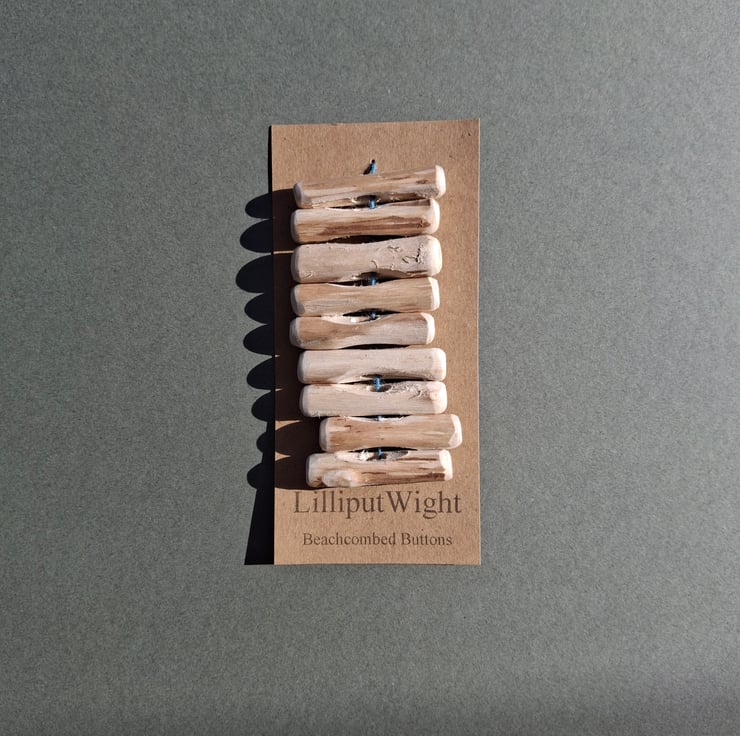 These buttons have been handmade by me in my dad's shed. The driftwood has been collected during walks on the beach before being washed and dried and making the short trip to the shed.