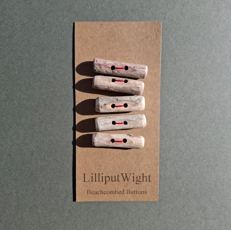 This set of five toggle style buttons has been handmade from driftwood collected from the beach close to my home on the Isle of Wight. These natural wood buttons would be perfect on a squashy garter stitch cardigan.