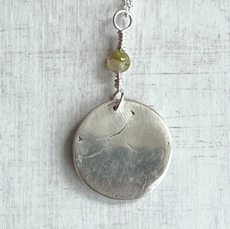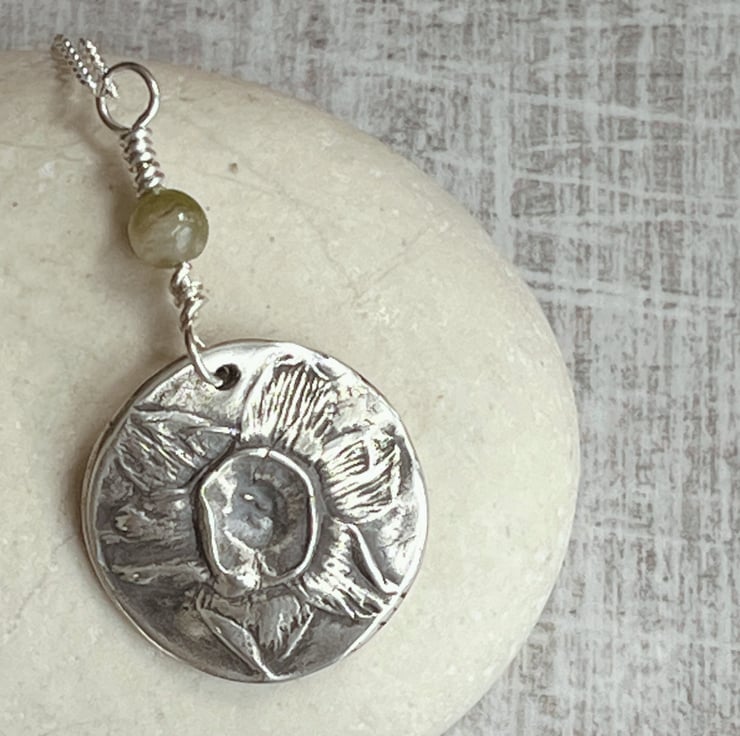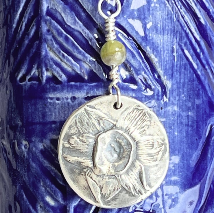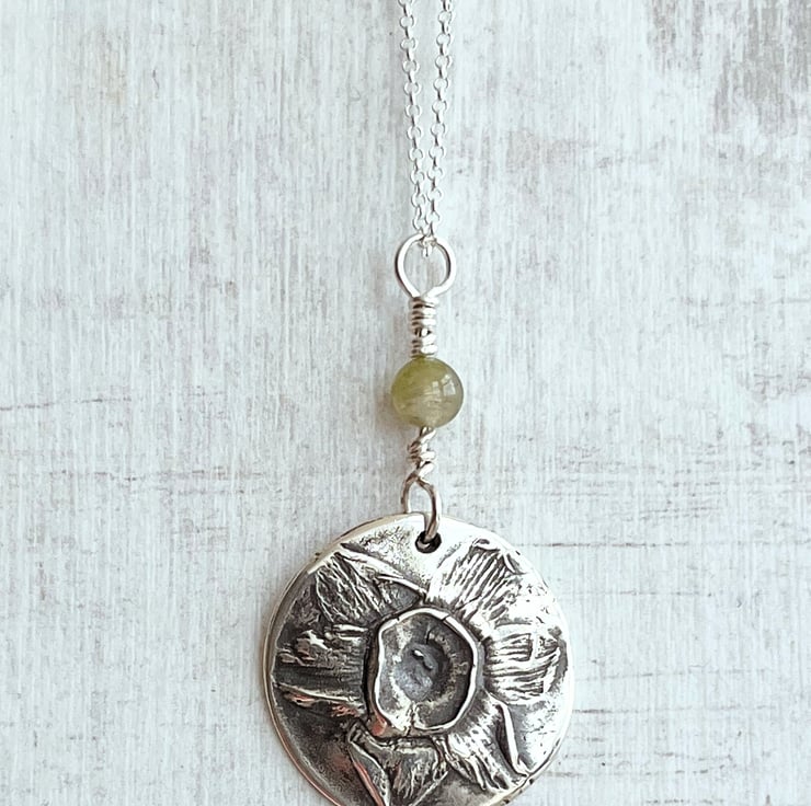 Silver pendant with impression of mini daffodil, with an organic hand made appearance. To add a bit of extra sparkle I have added a semi precious tourmaline stone on silver wire. The pendant has been given a patina which brings out the detail of the flower. It is quite a bit larger in diameter than a five pence piece - see photo for scale.