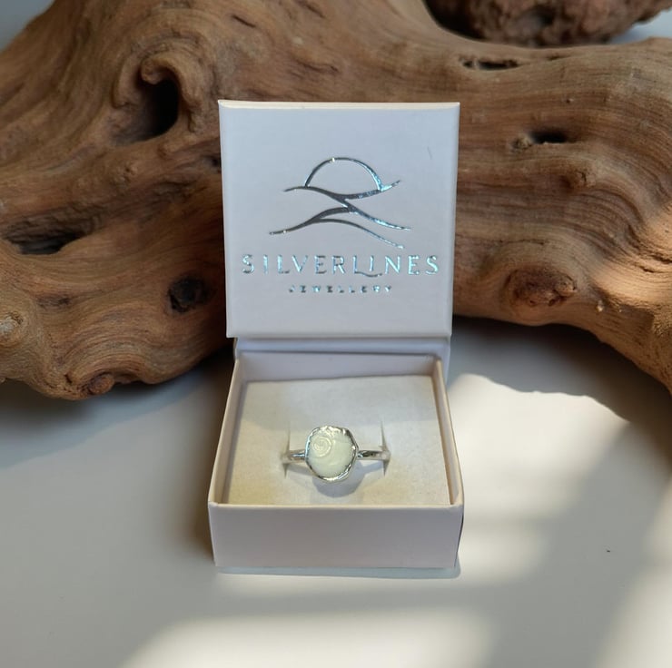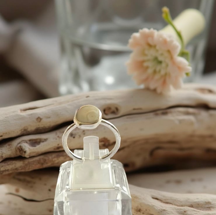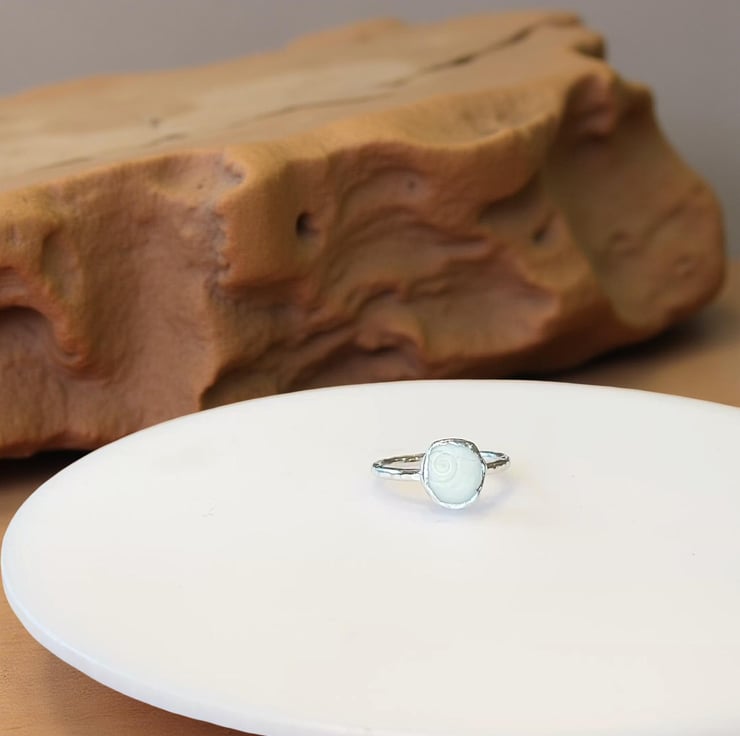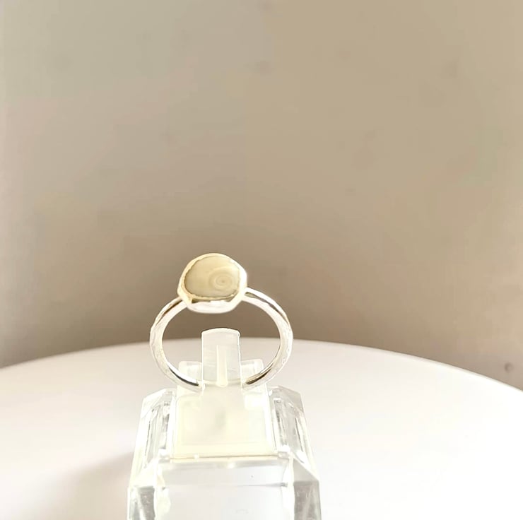 A unique handmade bohemian sea shell ring crafted by SilverLines Jewellery in Woolacombe, North Devon. this organic sea shell., naturally formed in a flat spiral, with rustic textures and earthy tones, making each piece one of a kind.