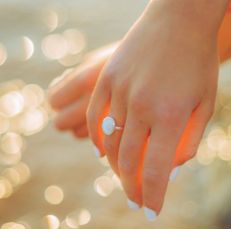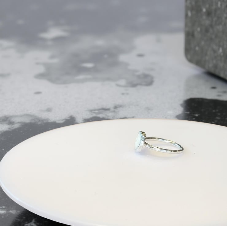 The shell is delicately framed with fine silver and backed with solid sterling silver. A sterling silver ring band with a hand hammered texture.