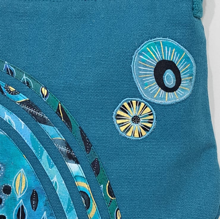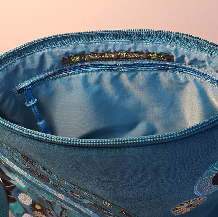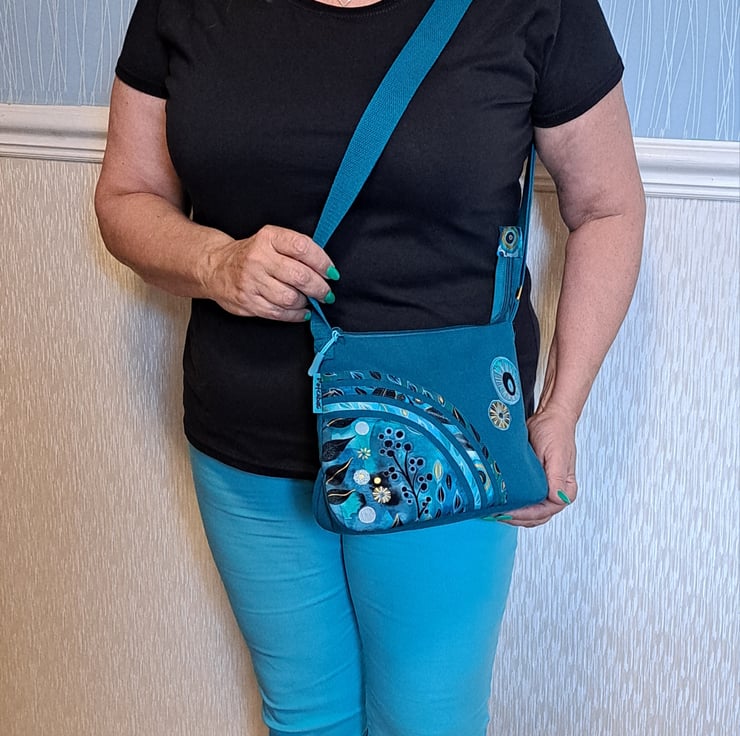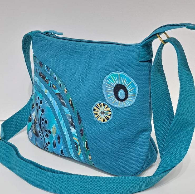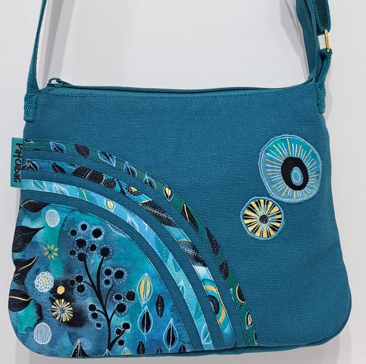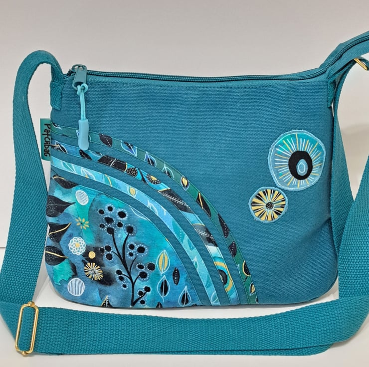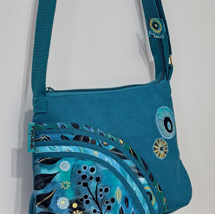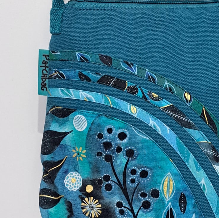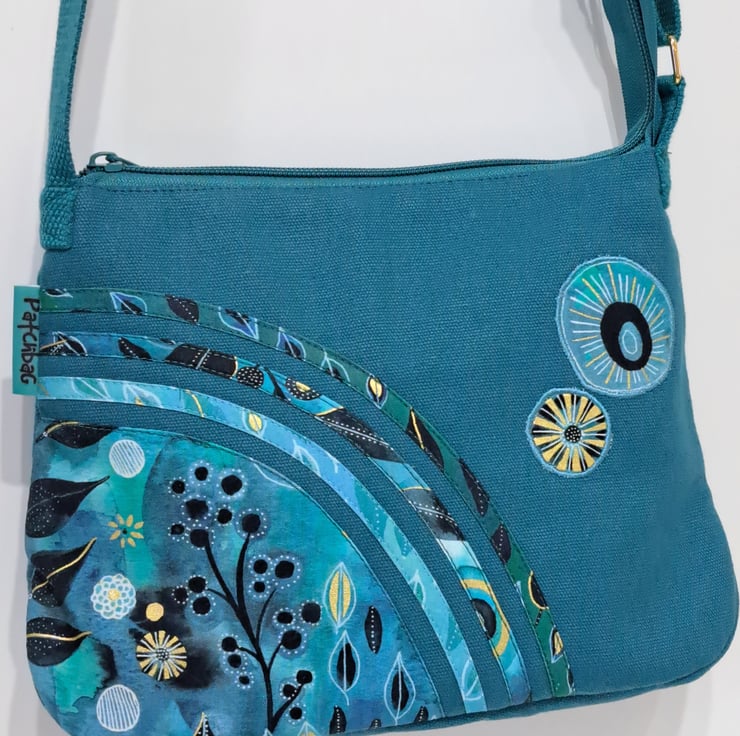 Patchwork and applique handbag with quilted back in teal colour with flowers and leaves. The main colors are different shades of green and blue with some black and gold. The wonderful fabric what I used for my bag from Essoldo Design. The handbag closing with zip on the top, the shoulder strap is adjustable. The shoulder bag has inner pocket with zip closure. The lining made from waterproof fabric. This is a small size handbag, the dimensions are the following: hight 20cm, width 27cm, depth 8.5 cm on the bottom of the bag. This is a lightweight handbag, ideal for holidays.
