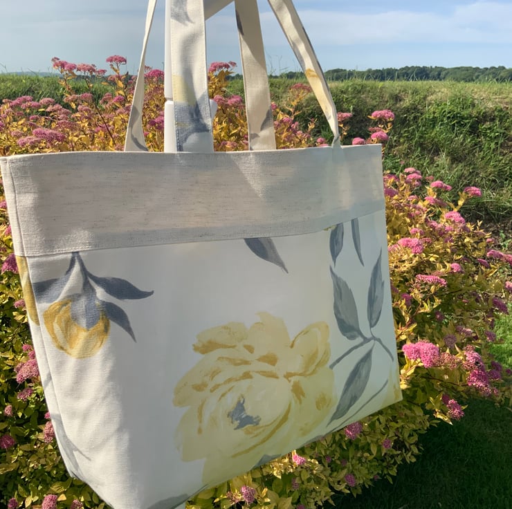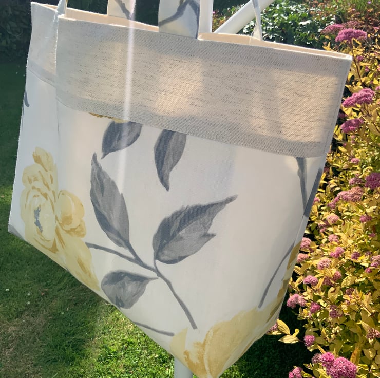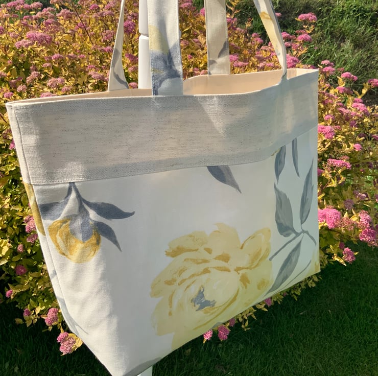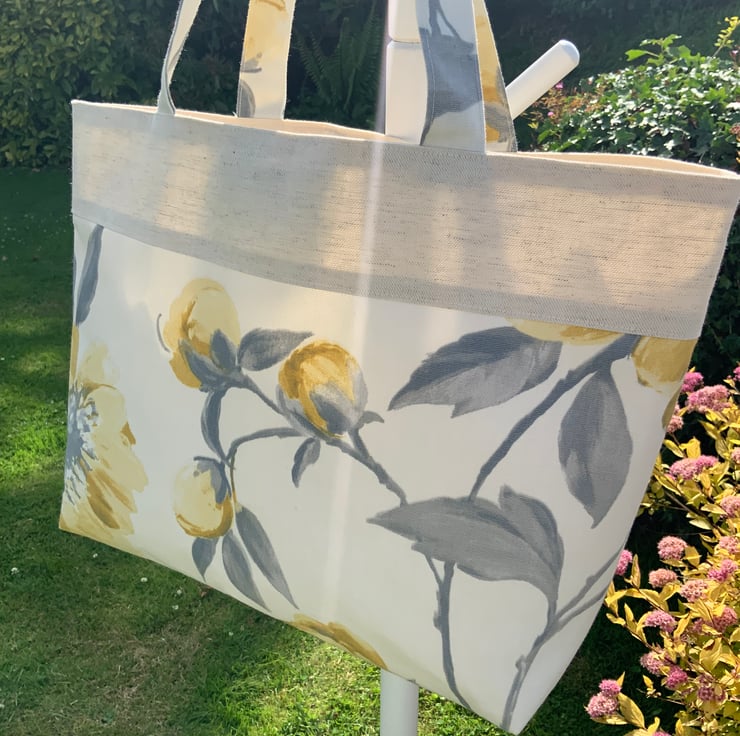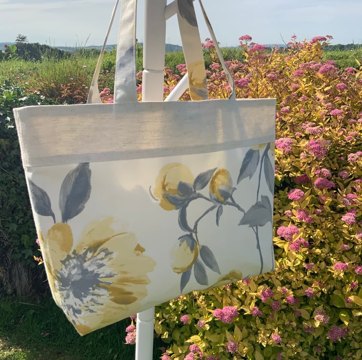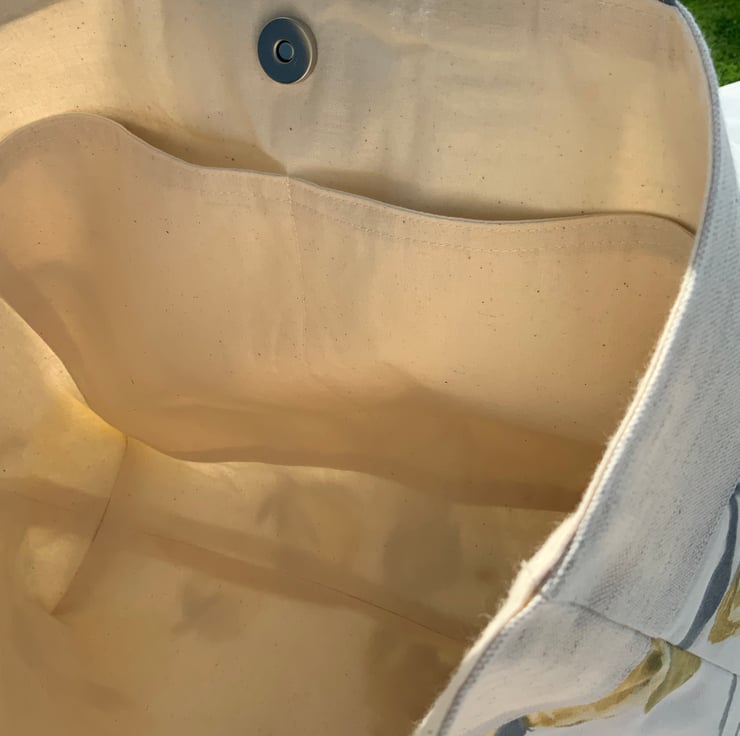 Beautiful handmade fabric tote bag. A perfect bag for day to day use, ideal for work, school, gym, shopping etc. Made from quality cotton and interfaced to give it structure. Internally, it has a large slip pocket divided into two sections and is fitted with a magnetic snap closure. The square bottom gives the bag extra depth.