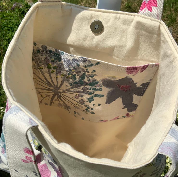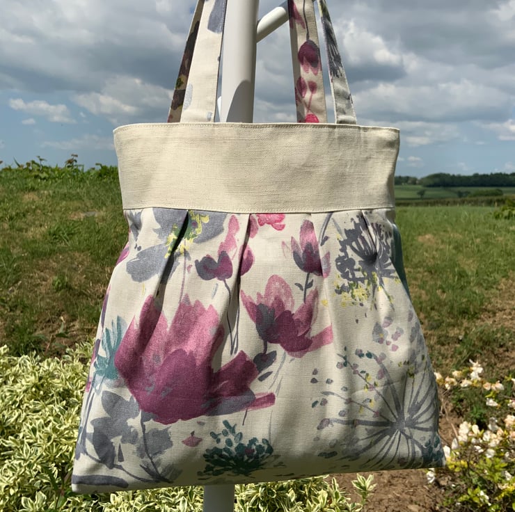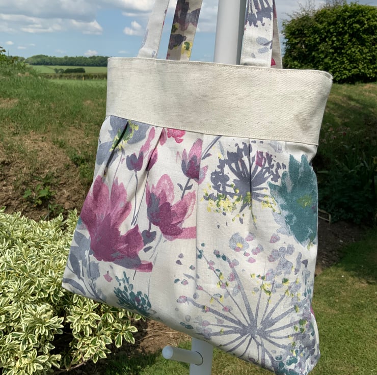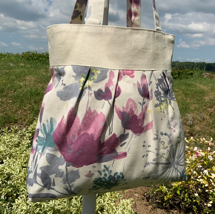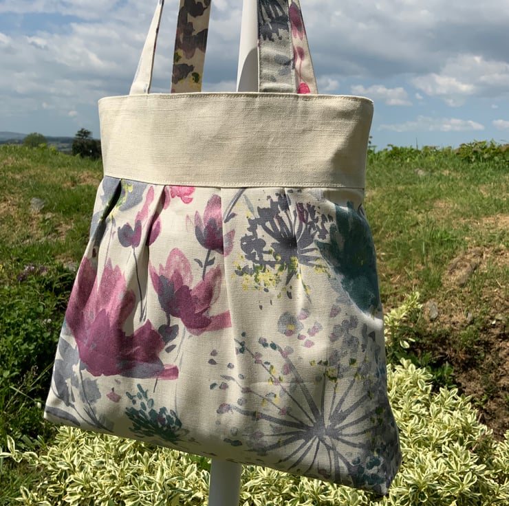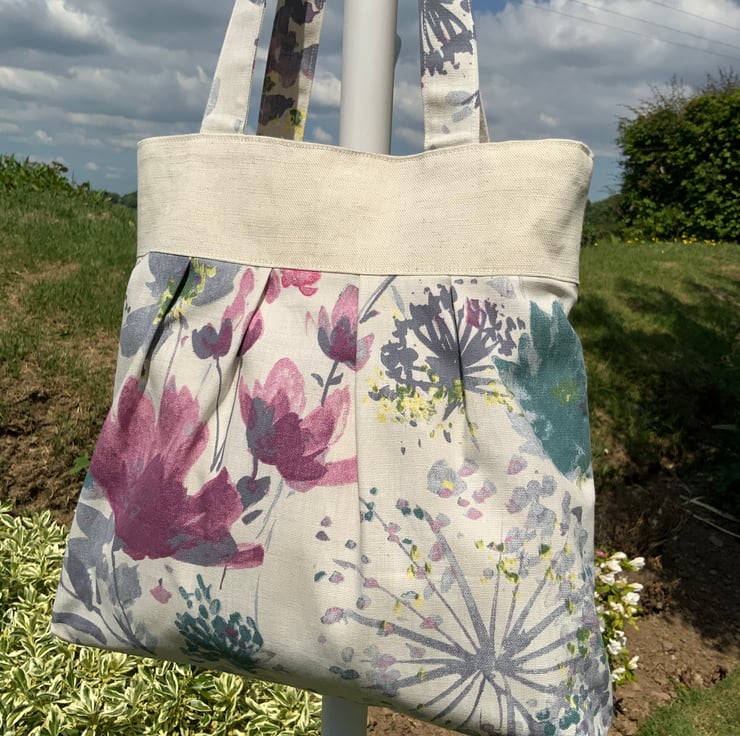 Beautiful pleated tote bag. Linen band at top with a floral cotton fabric beneath. Lined with natural calico cotton fabric with a layer of interlining sandwiched in between to give it a little structure. Internally, it has a small slip pocket and is fitted with a magnetic snap fastener. The square bottom gives the bag extra depth.