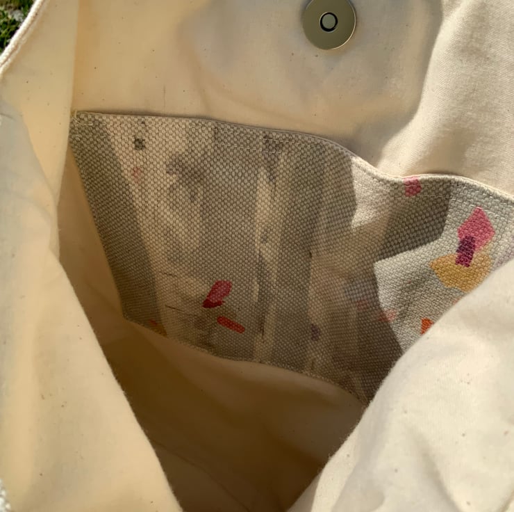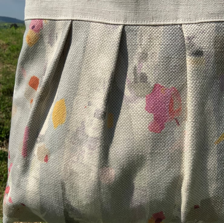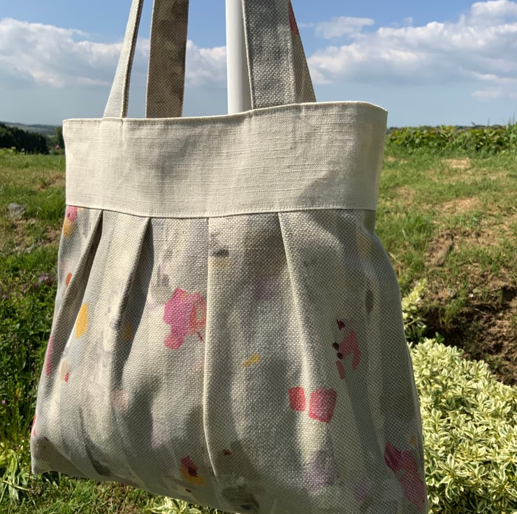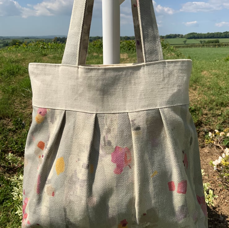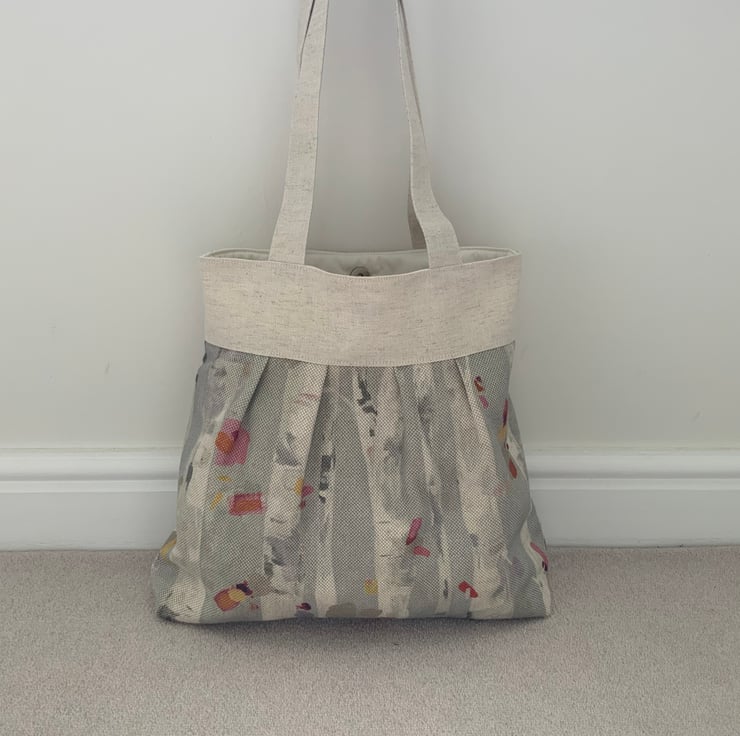 Beautiful pleated tote bag. Linen band at top with Voyage ‘Hopea’ fabric beneath. Lined with natural calico cotton fabric with a layer of interlining sandwiched in between to give it a little structure. Internally, it has a small slip pocket and is fitted with a magnetic snap fastener. The square bottom gives the bag extra depth.