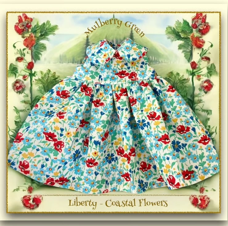 A beautiful dress in Liberty Coastal Flowers fabric, to fit the Mulberry Green characters. The dress is made from best quality designer cotton and has a Peter Pan collar and a lined bodice.