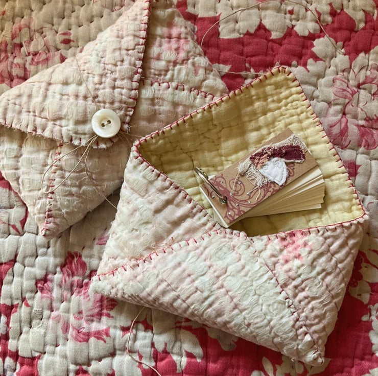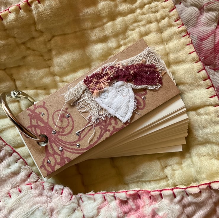 A gorgeous set comprising of a handmade vintage quilt envelope and a mini keyring notebook.