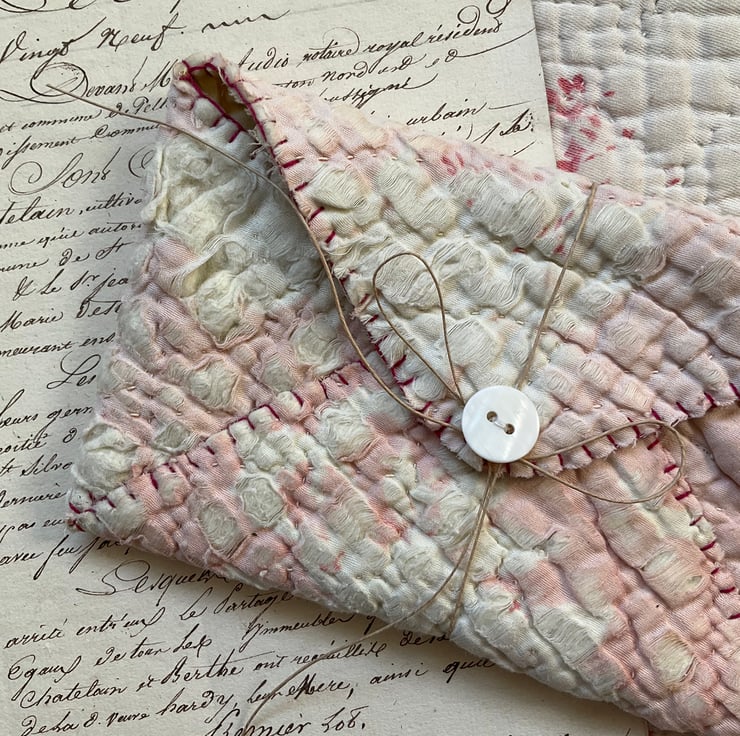 The notebook tucks inside the quilt envelope, and there may be room for other small sewing accessories. The envelope is edged in blanket stitch. It fastens with jute twine which ties around the pearl button.