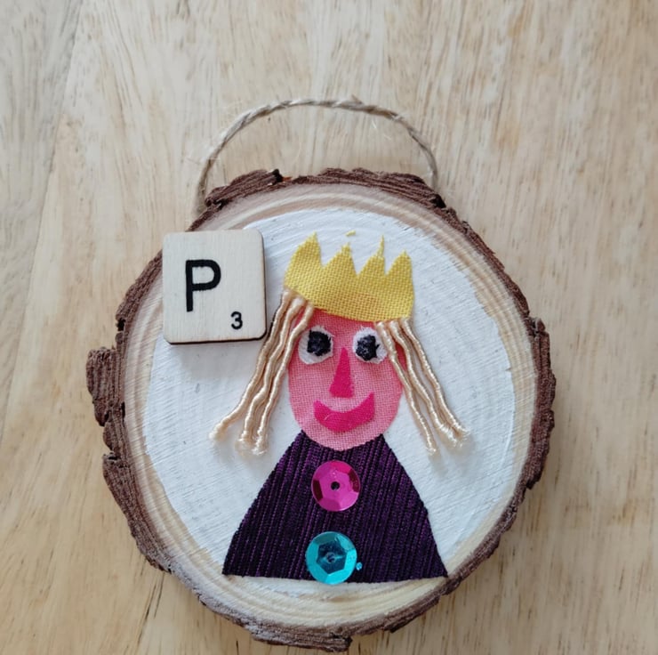 Individual one-off wall art on wooden base using fabric, paint, paper, colours and joy, hung with string. Can be made to order. Happy to take bespoke orders for anything. If for a specific person I can use their first initial and an image they would like.