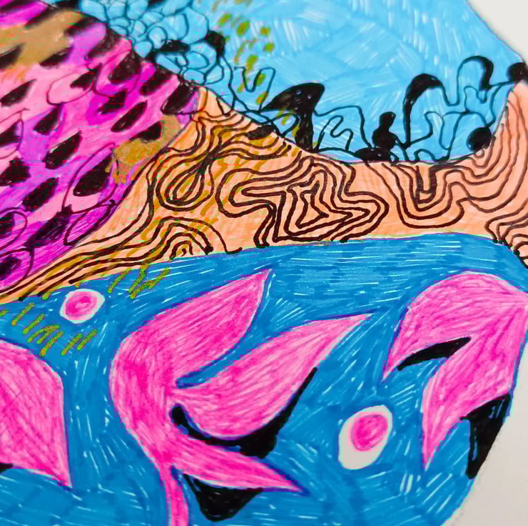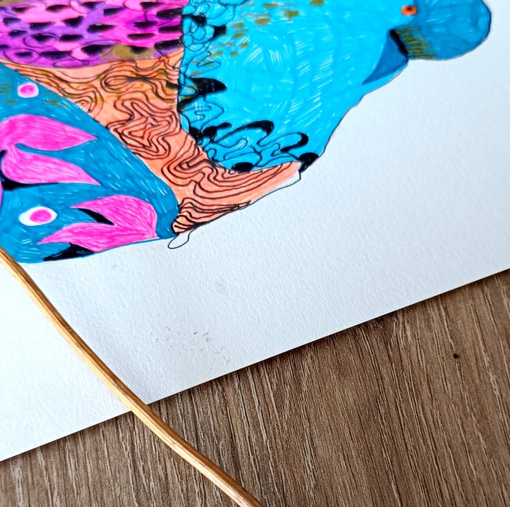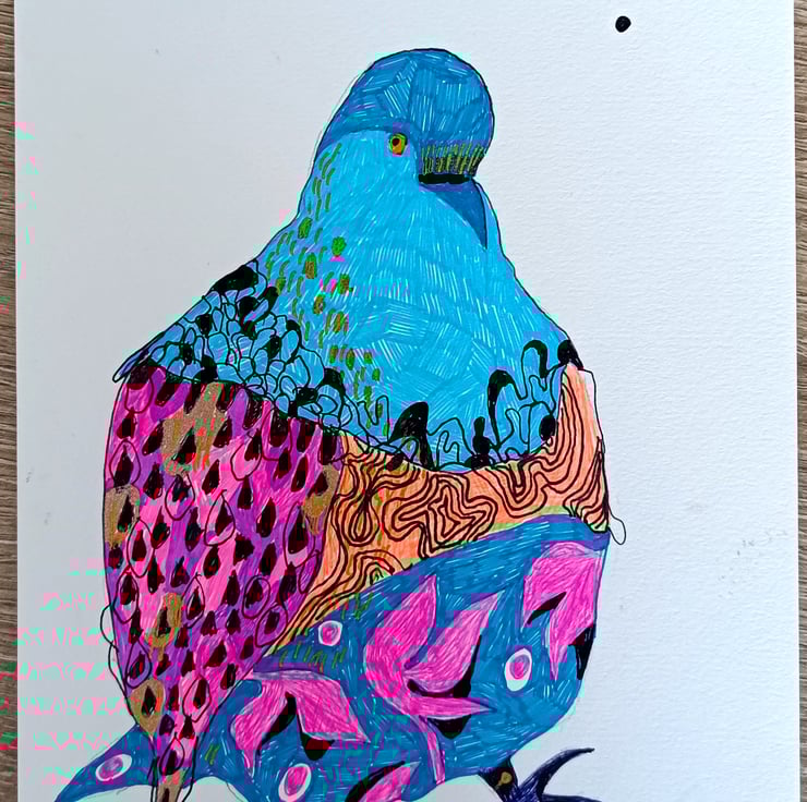Ink bird illustration on A5 230g paper. Original artwork of abstract pigeon in bright and bold colours.Created from a combination of different abstract shapes and textures. A small sized artwork that could brighten up your space and mood. Could be great if lined up with similar pieces of artwork!!!