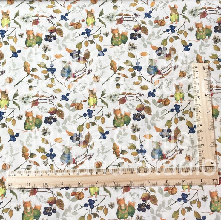 Featuring stunning watercolour designs in highest quality quilt weight 145gsm cotton. All the shades of autumn appear in the botanical leaves and berries whilst delightful mouse characters go about their harvest.