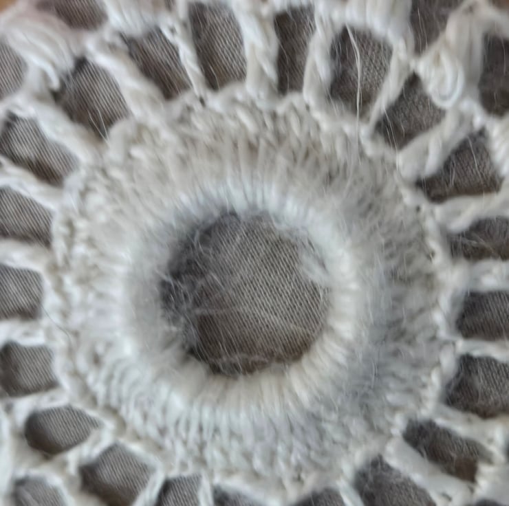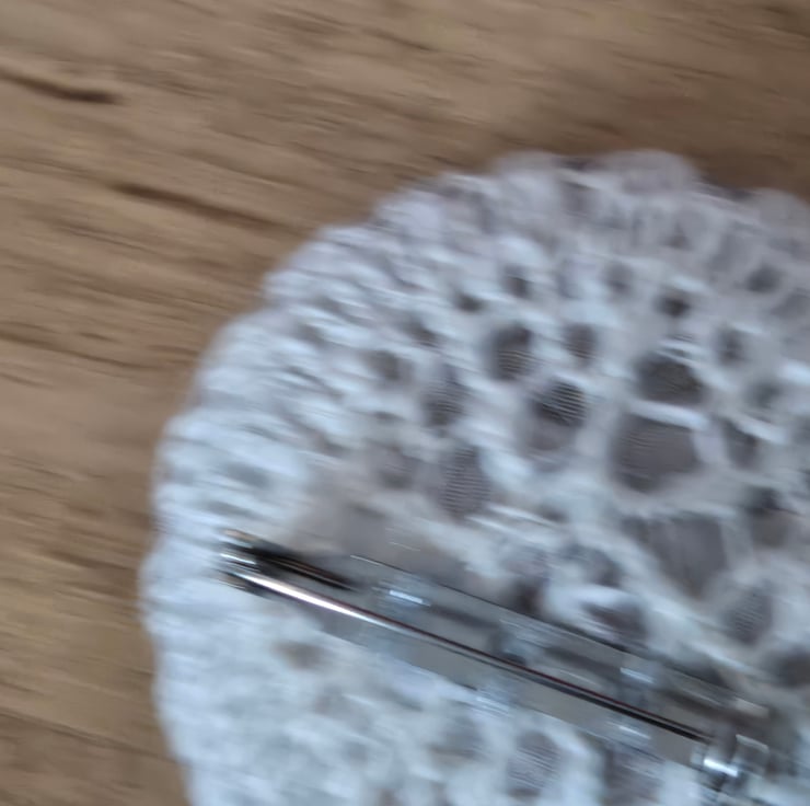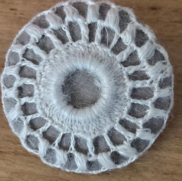 This brooch, has been created by covering a large button in silk and then crocheted with nettle (ramie) cream yarn.It has a saftey pin with a safety latch so it cannot fall off your garment. The brooch is approx 5cm in diameter.