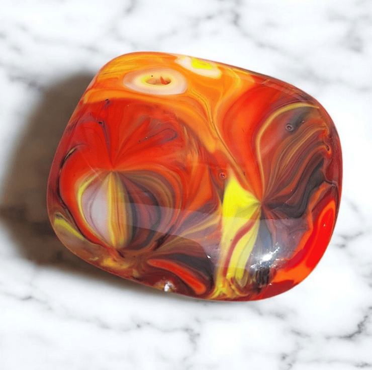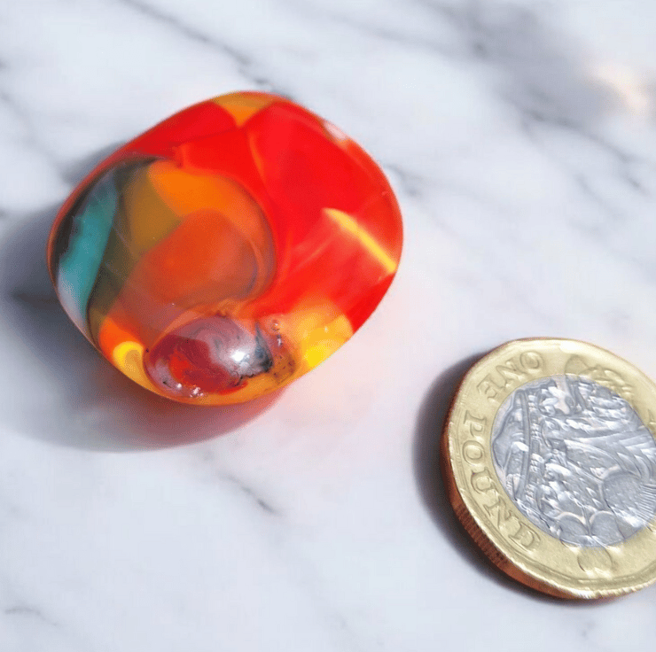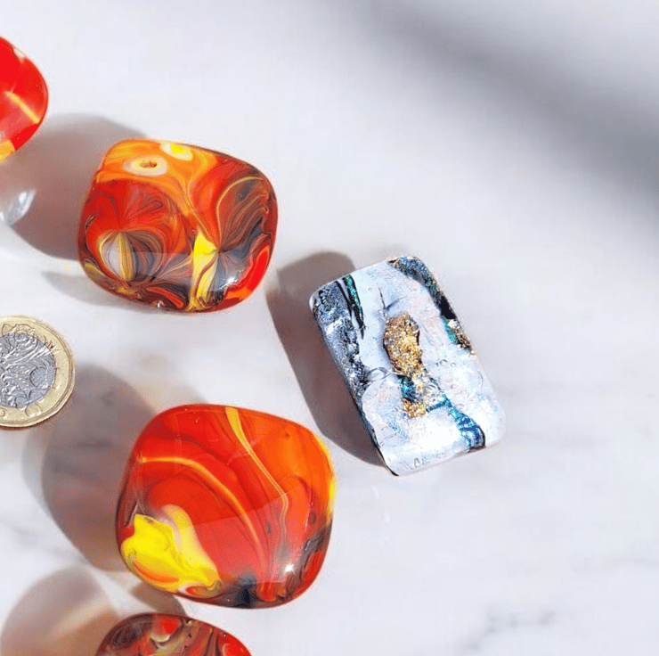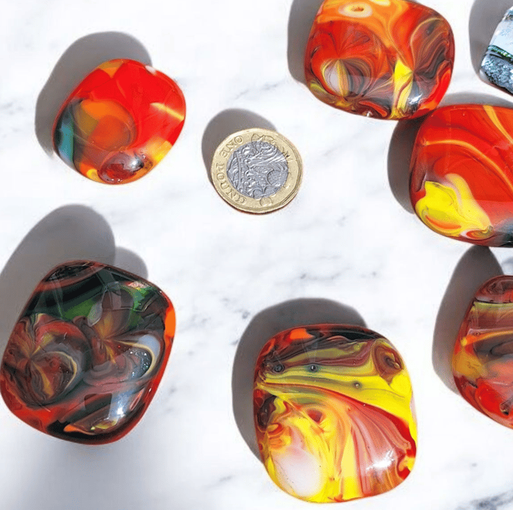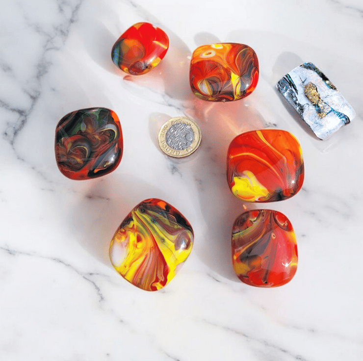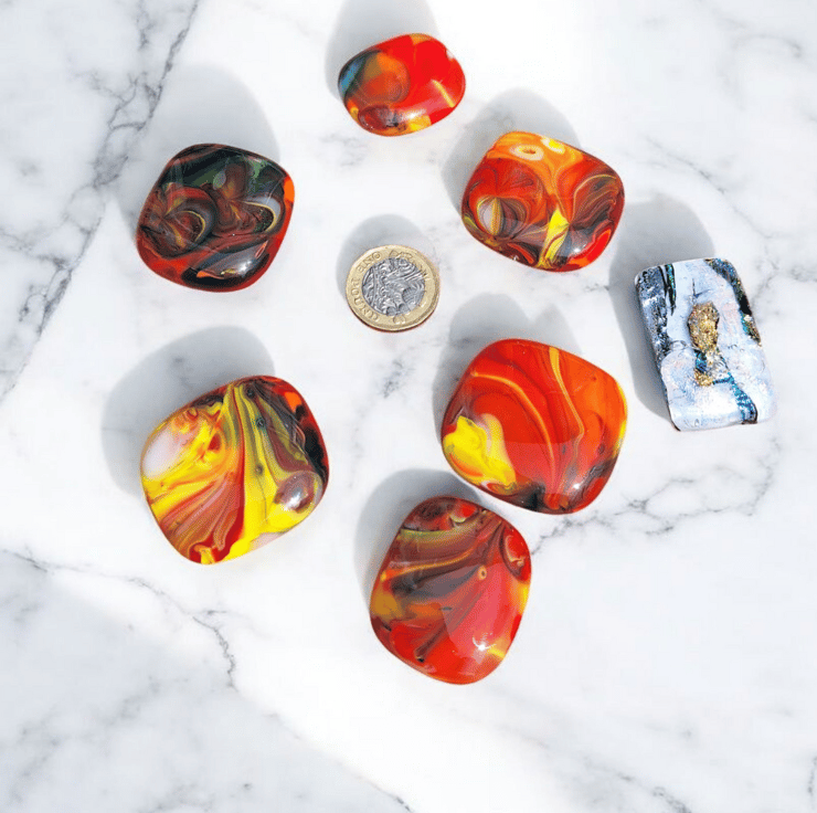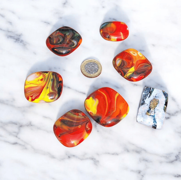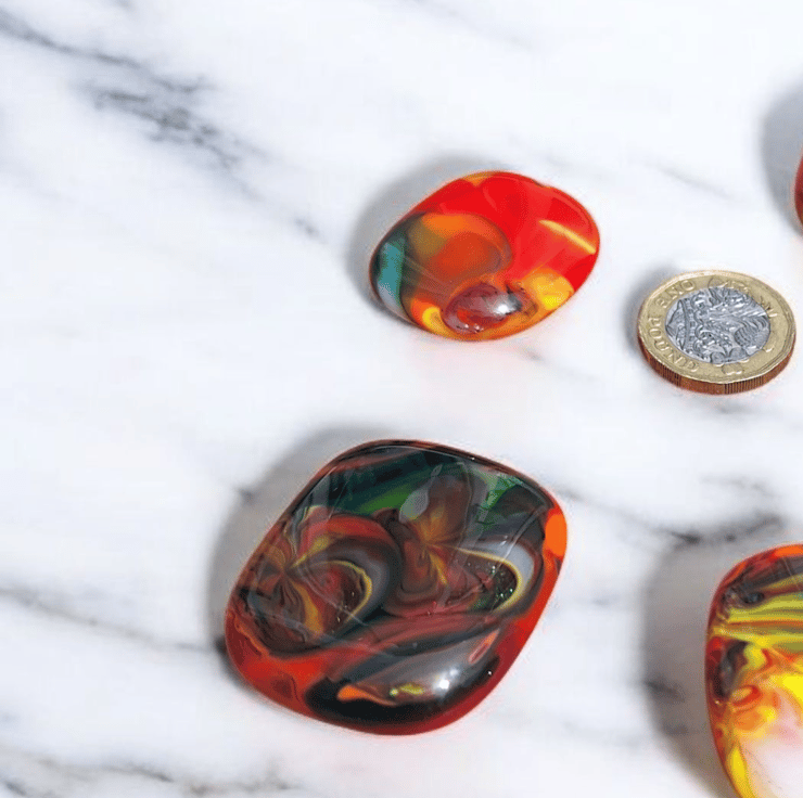 Handmade in my Blackpool home studio this colourful bundle of six fused glass cabochons plus one shimmering dichroic pendant is perfect for crafters who love working with handmade materials. Each piece was created using the mesh method then carefully cut washed and fired again to achieve a smooth glossy finish. They are flat backed and undrilled with no holes making them ideal for wire wrapping mosaics or embedding in resin.
