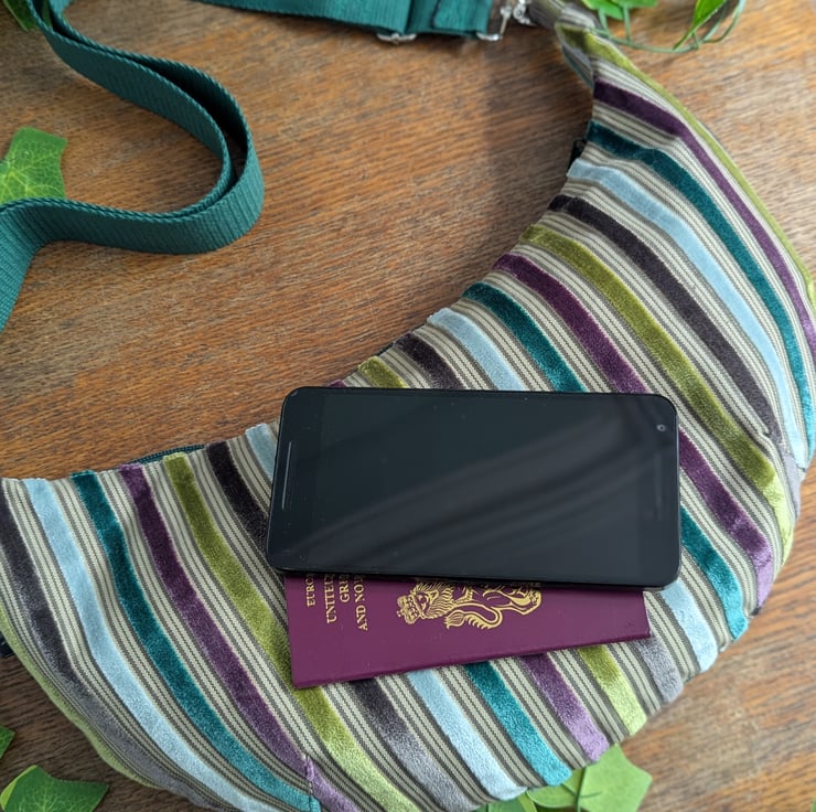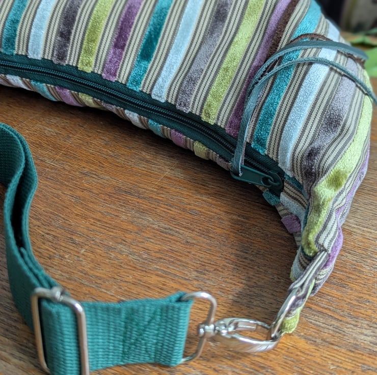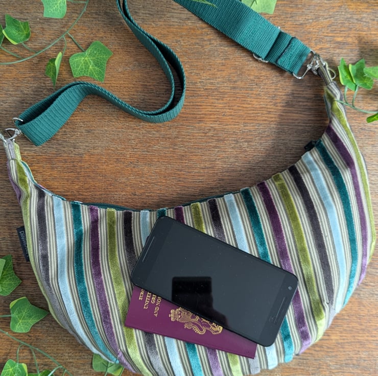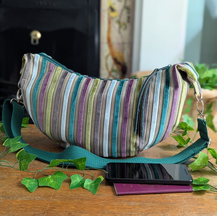 Striped chenille offcut in rich but muted colours, compact sling or dumpling bag. This crossover croissant shaped bag has can be worn worn high or low across the body, or wear as a shoulder bag.