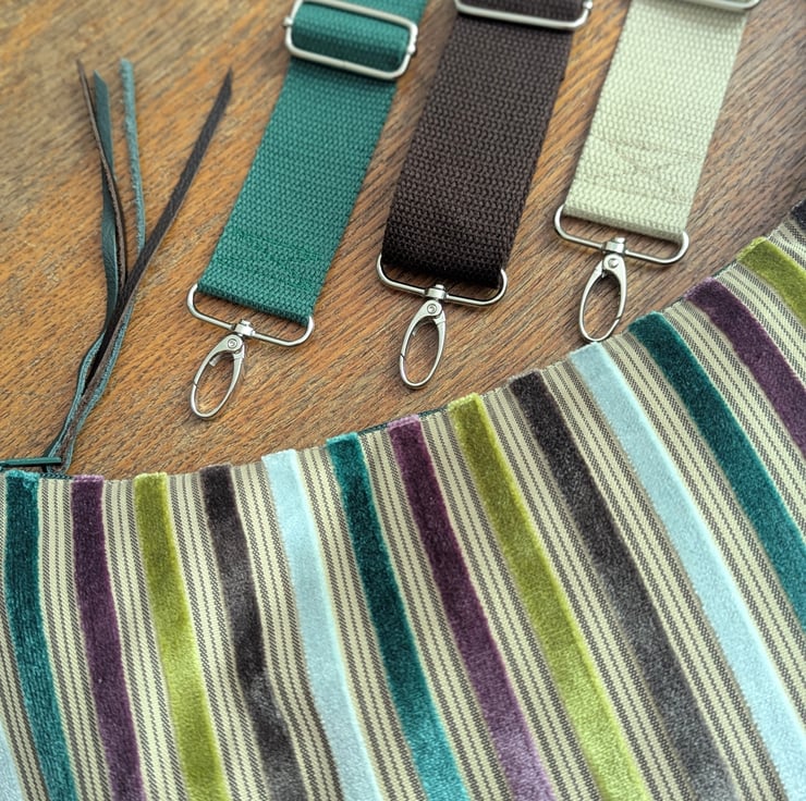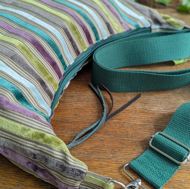 It has a forest green strap and a matching chunky nylon zip with green and brown leather zip pull secures the bag. But if you'd like to be able to mix it up, add in another colour strap.