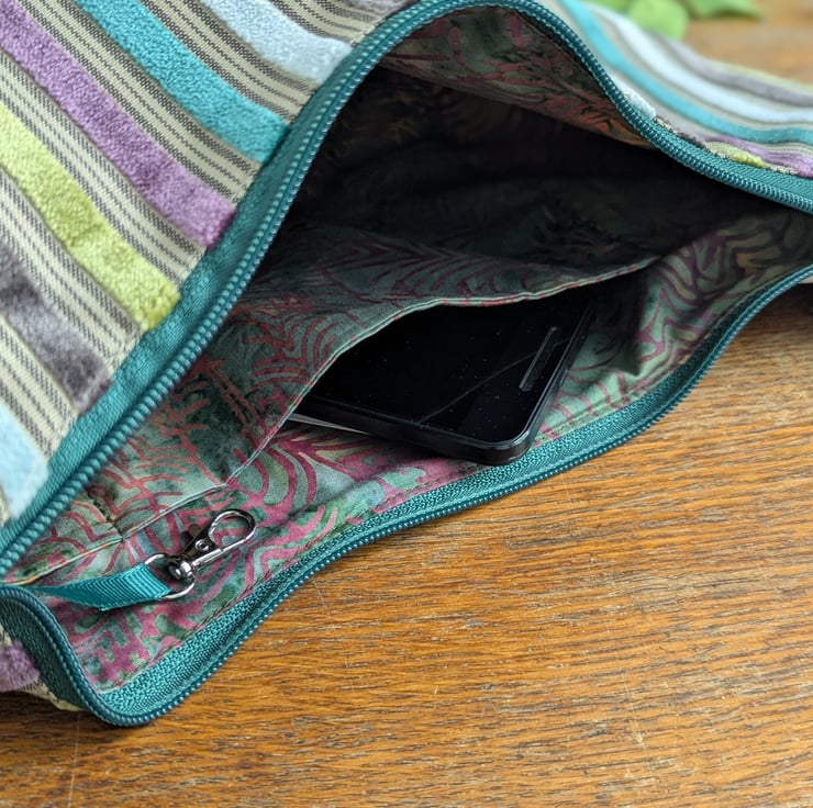Great for travelling or everyday use and made using a tactile striped chenille upholstery fabric. The main compartment is lined with a batik print cotton with a slip pocket for a phone and pens etc.