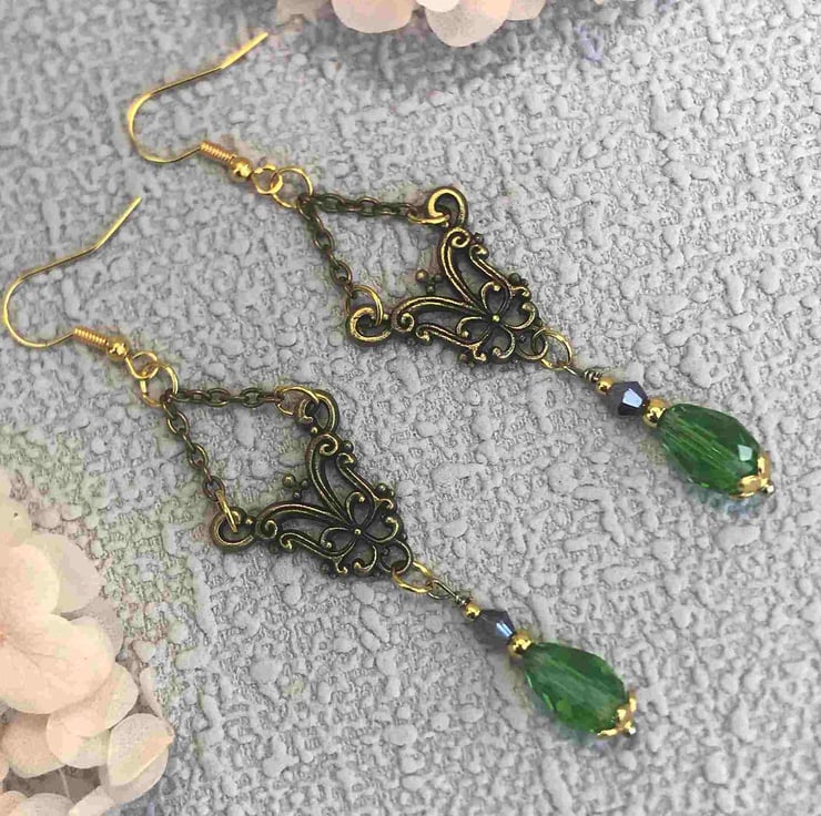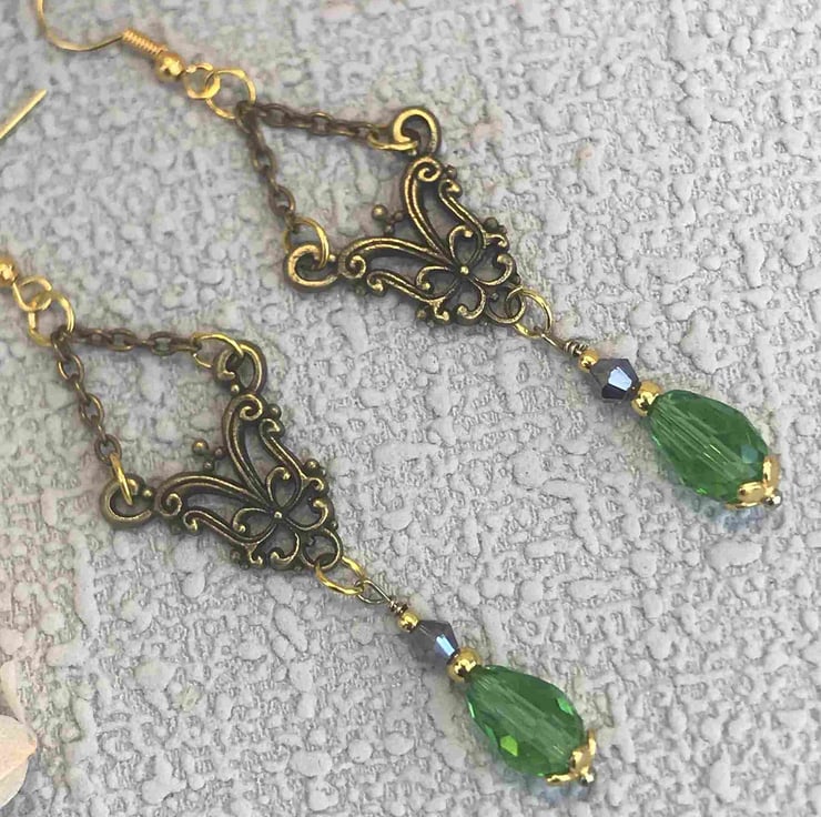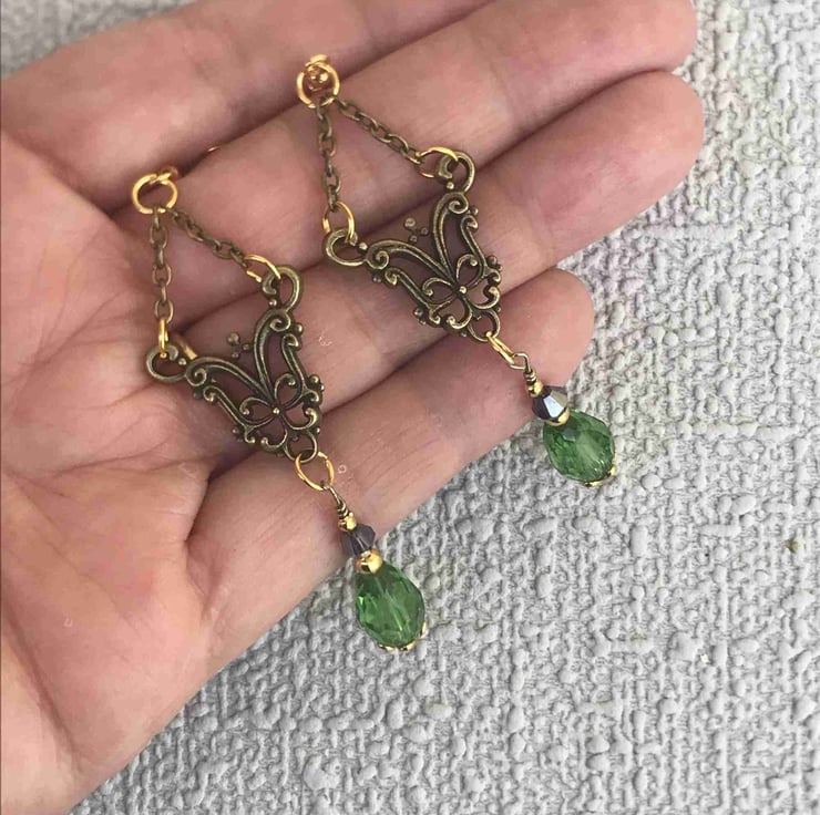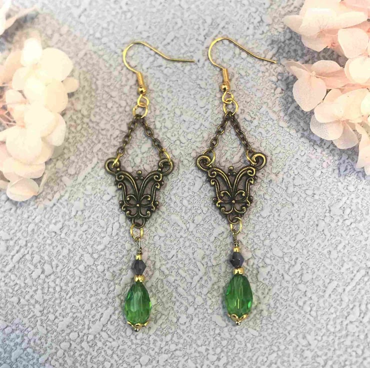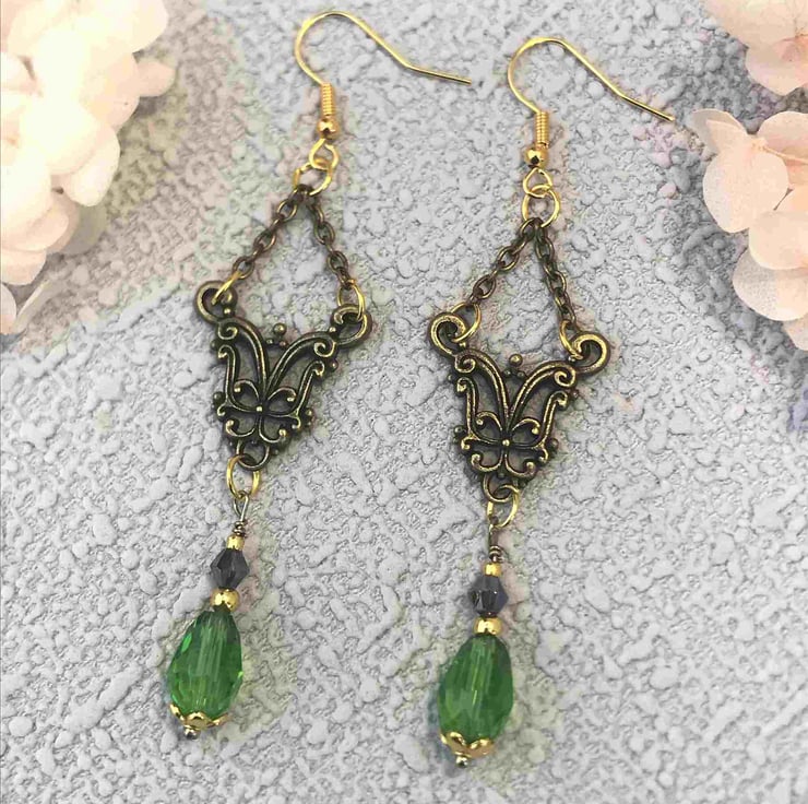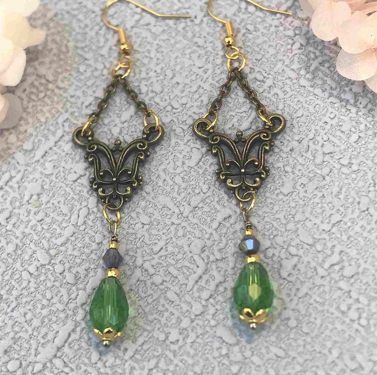 These charming earrings are made with antique bronze chandelier connectors with apple green teardrop glass drop beads attached to the bottom. The earrings are finished with gold-plated ear wires and they are 8cm in total length.