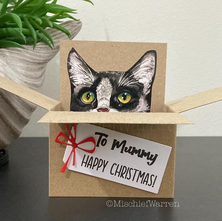 Tuxedo Cat Card; Birthday or Personalised. Cat in a box gift card holder