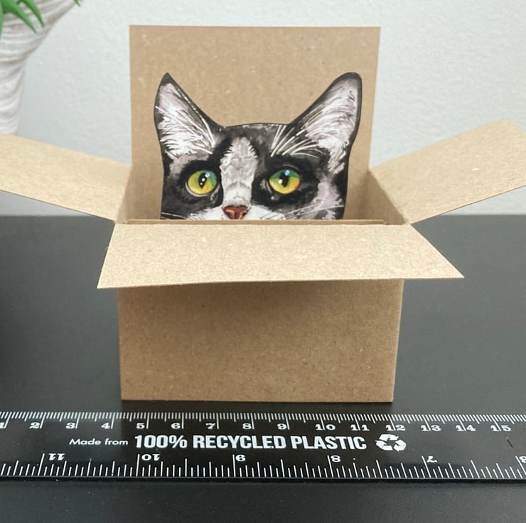 Tuxedo cat in a box card - a great birthday card or gift card holder for black and white cat lovers. The recycled kraft card “box” opens to reveal a peeking tuxedo cat. Designed and handmade entirely by me (including my tuxedo cat painting) here in Devon.