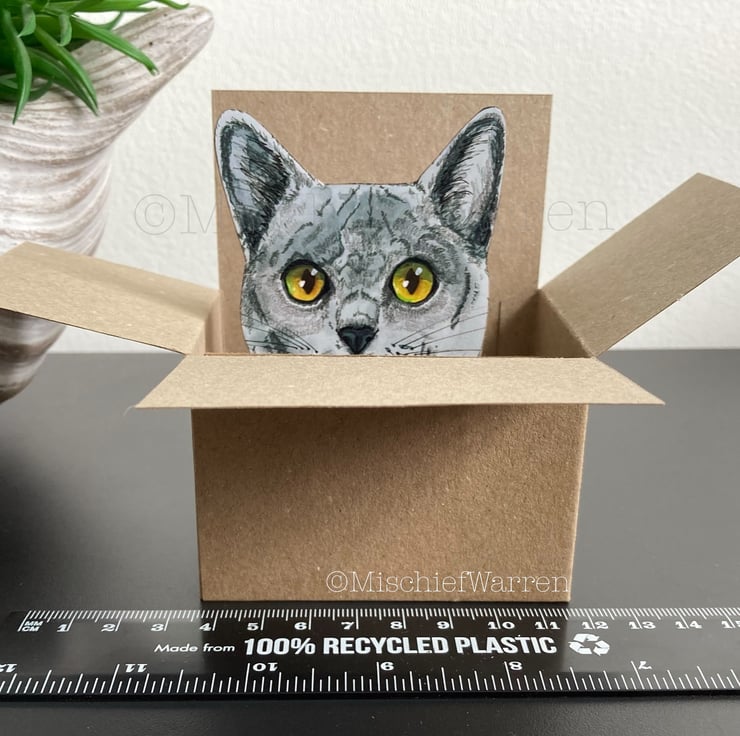 The recycled kraft card “box” folds open to reveal a peeking Chartreux, Blue British Shorthair or Korat cat. Designed and handmade entirely by me (including my blue grey cat painting) here in Devon.