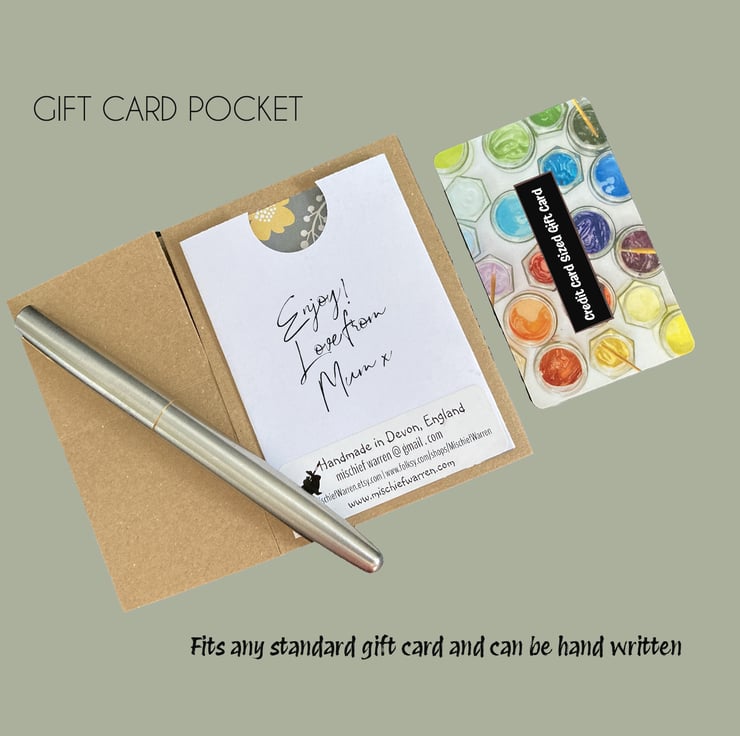 The rear includes a blank panel (from recycled white card) for your own words. I’m happy to write this for you and can send direct to recipient if you’re short on time. Alternatively, this card can also be a gift card holder with the addition of a little pocket for a standard sized gift card.