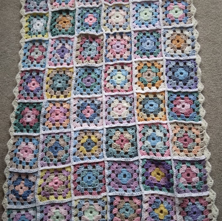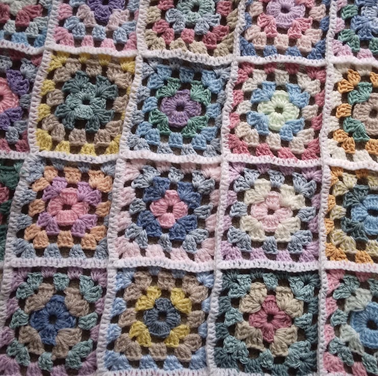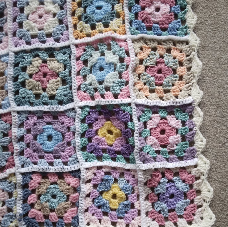 Crochet granny squares blanket handmade in rich pastel colours. Perfect for a baby blanket or a lap blanket. Measures approx 38 ins (97 cm) x 28 ins (71 cm).