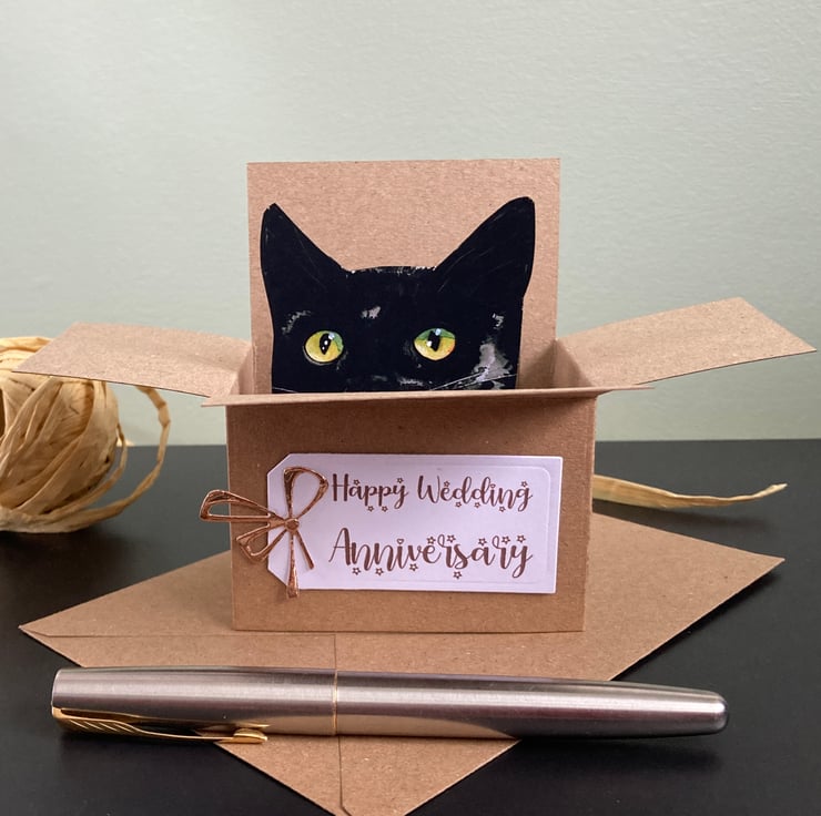 Cat Wedding Anniversary Card. My unique cat in a box card - a great anniversary card or gift card holder for cat lovers. A recycled kraft card “box” opens to reveal a peeking cat (many options available and please ask if you'd like a custom cat). Designed and handmade entirely by me, including my hand drawn/painted cat illustrations. I can print a personalised sentiment on the tag and change the bow colour to your choice.