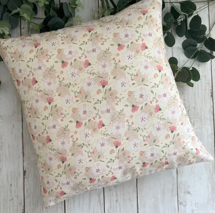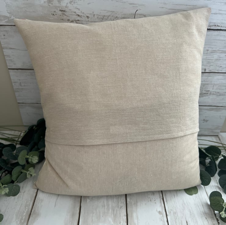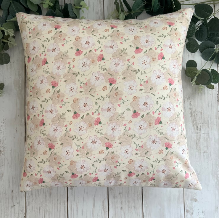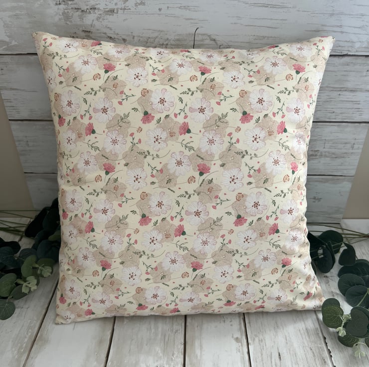 Lovely cushion, in a floral pink, white, beige & green floral design to the front and a co-ordinating beige linen fabric to the back. A lovely addition to any home.