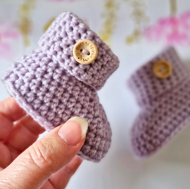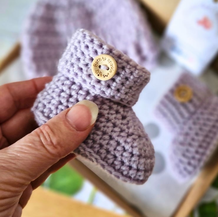 This adorable crochet baby gift set includes a soft beanie hat and matching booties, each finished with sweet 'Born to Sparkle' wooden buttons. Lovingly handmade with Stylecraft Special DK yarn, this set is a perfect gift for newborns and babies up to 6 months. It's ideal for baby showers, new arrivals, or a thoughtful keepsake for a little one.