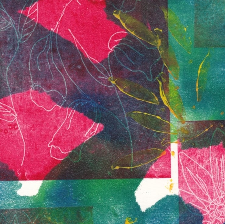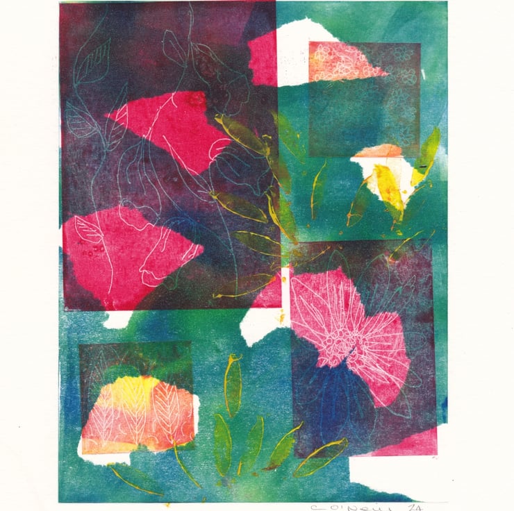 A vibrant monoprint in emerald greens and fuscia pinks, will brighten up any room. This print is made by over layering small pieces of perspex which as different inks and patterns drawing into it.