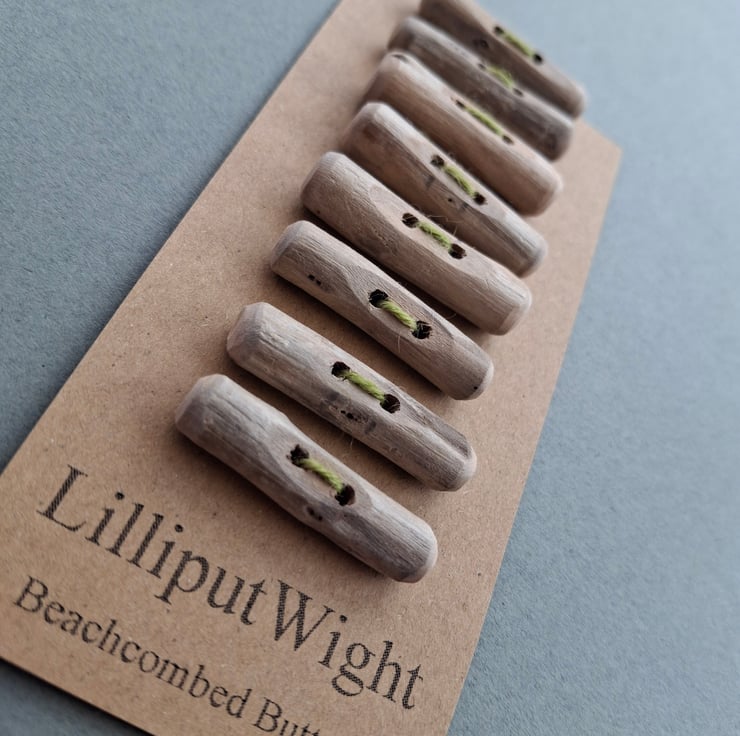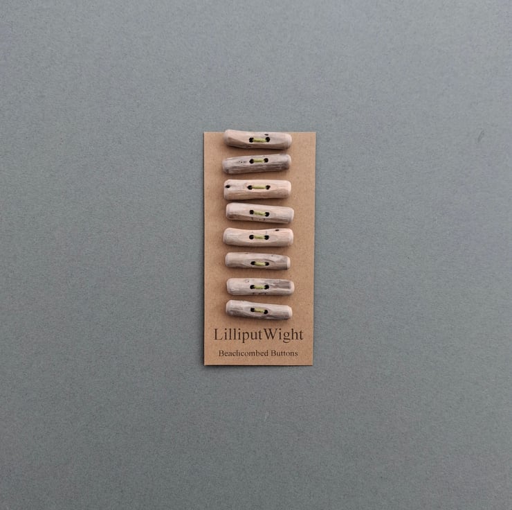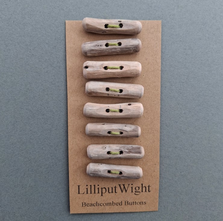 This set of eight toggle style buttons has been handmade from driftwood collected from the beach close to my home on the Isle of Wight. These natural wood buttons would be perfect on a squashy garter stitch cardigan.