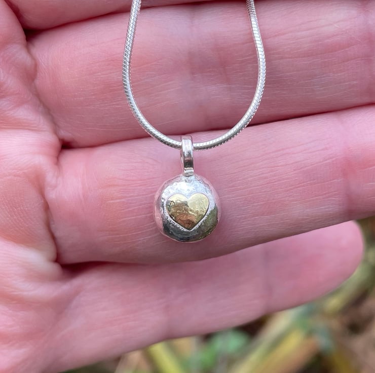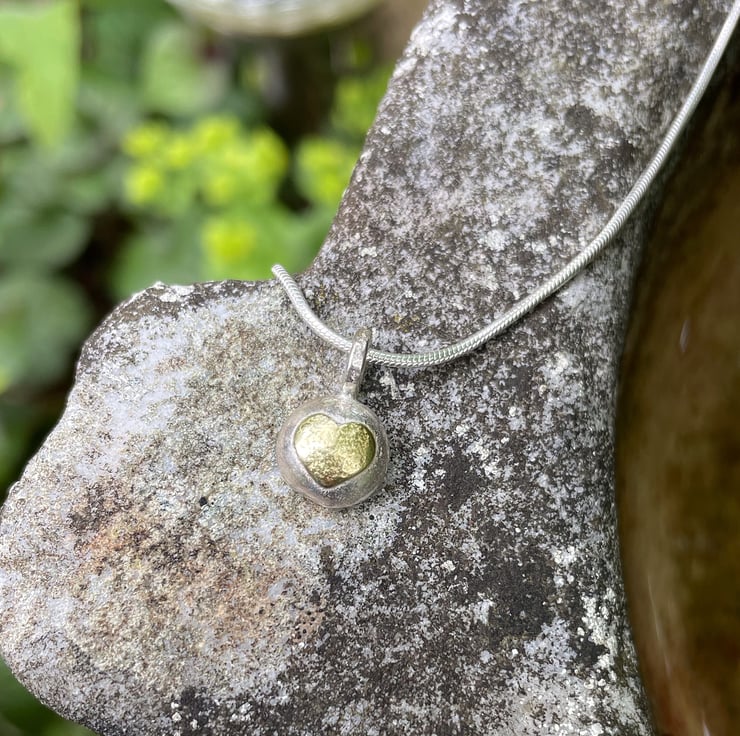 A solid thick recycled sterling silver pebble with gold heart detail. The pendant has a beaten texture and has been polished to a subtle shine.